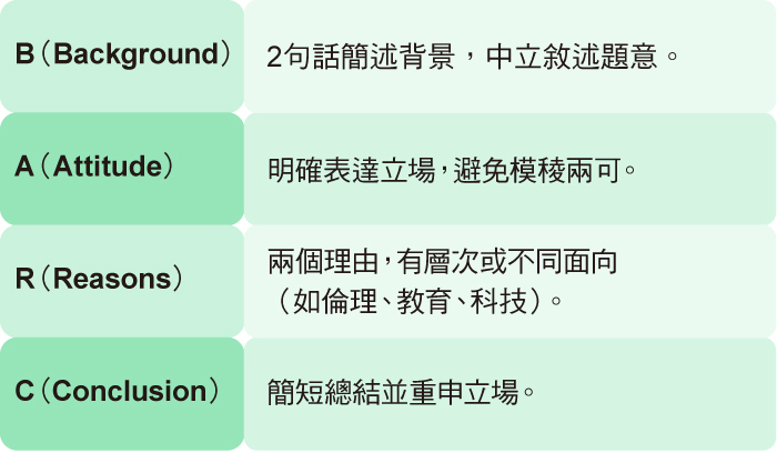 」,將教育、科技、文化、環保、心理與社會現象等常見議題分門別類,平日閱讀遇到可用的例證、數據與金句便立刻摘錄,久而久之,腦中就像裝了一座可隨取即用的資料庫。她強調,真正拉開差距的不是寫了幾篇,而是你是否擁有能迅速調動的素材系統。