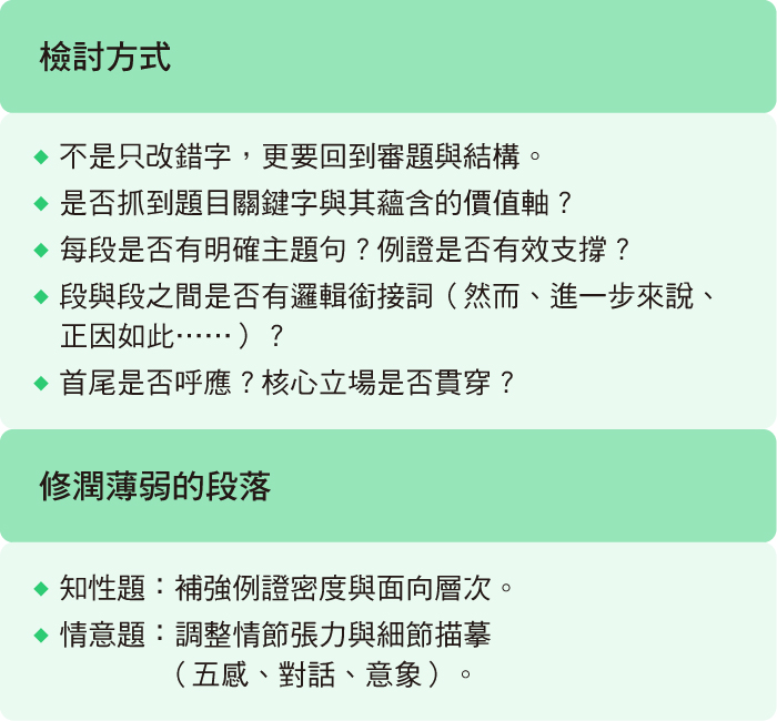 先快速閱讀題目,保留第一印象,再畫出心智圖或列出綱要。她的原則是「有綱不迷路」:哪怕只用三分鐘,也要把段落順序、分論點與例證的面向想清楚。她很少重寫整篇,但會在檢討後列出同題目的其他可走路線,藉此擴大思考半徑;下一次遇到類題,就能快速換角度安排材料。她也提醒,歷屆試題與高品質題本有範文可對照,做完一定要反讀——不是抄語氣,而是拆「鏡頭運動」:如何開場定位、在哪裡轉折、例證如何遞進、結尾怎麼回環。