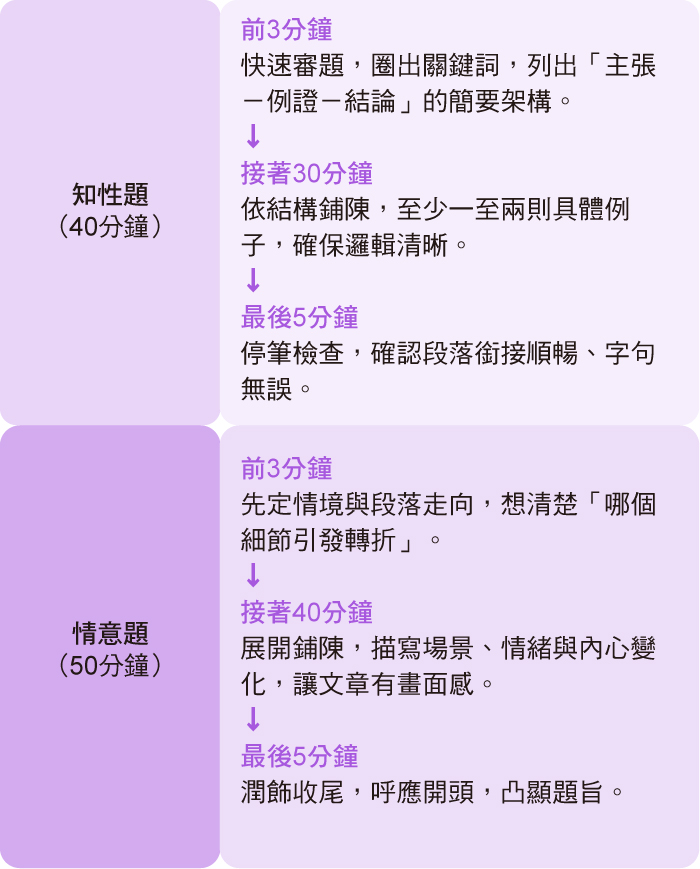 時間配置是考場勝負的第一道關卡。補教名師呂緋老師建議考試的寫作時間分配如下: