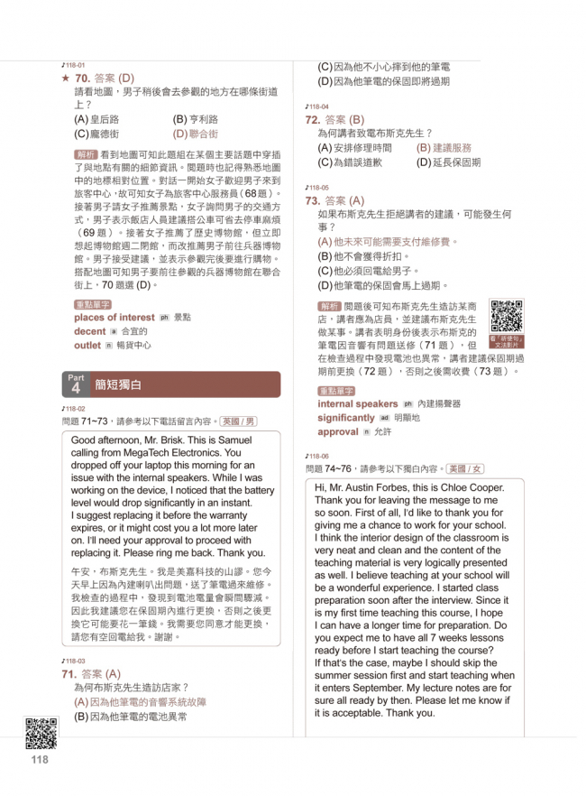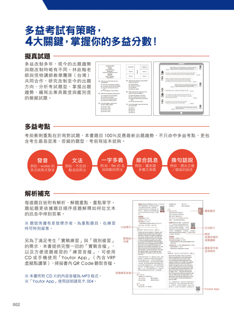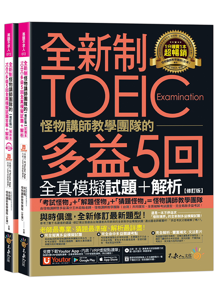 修訂版的內容新增擬真題型,幫學習者精準匡列高頻單字、常見句型以及多益情境。另外為了讓本書使用成效最大化,出版社特別研發「Youtor App」,內含VRP虛擬點讀筆的功能,讓學生可以使用手機隨掃隨聽,不管是練習或是逐題複習都非常方便。