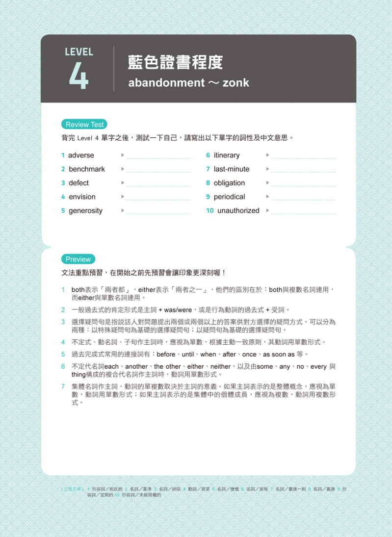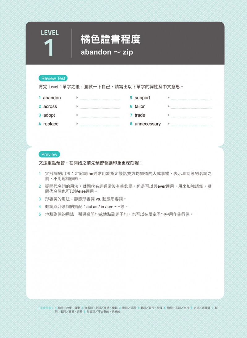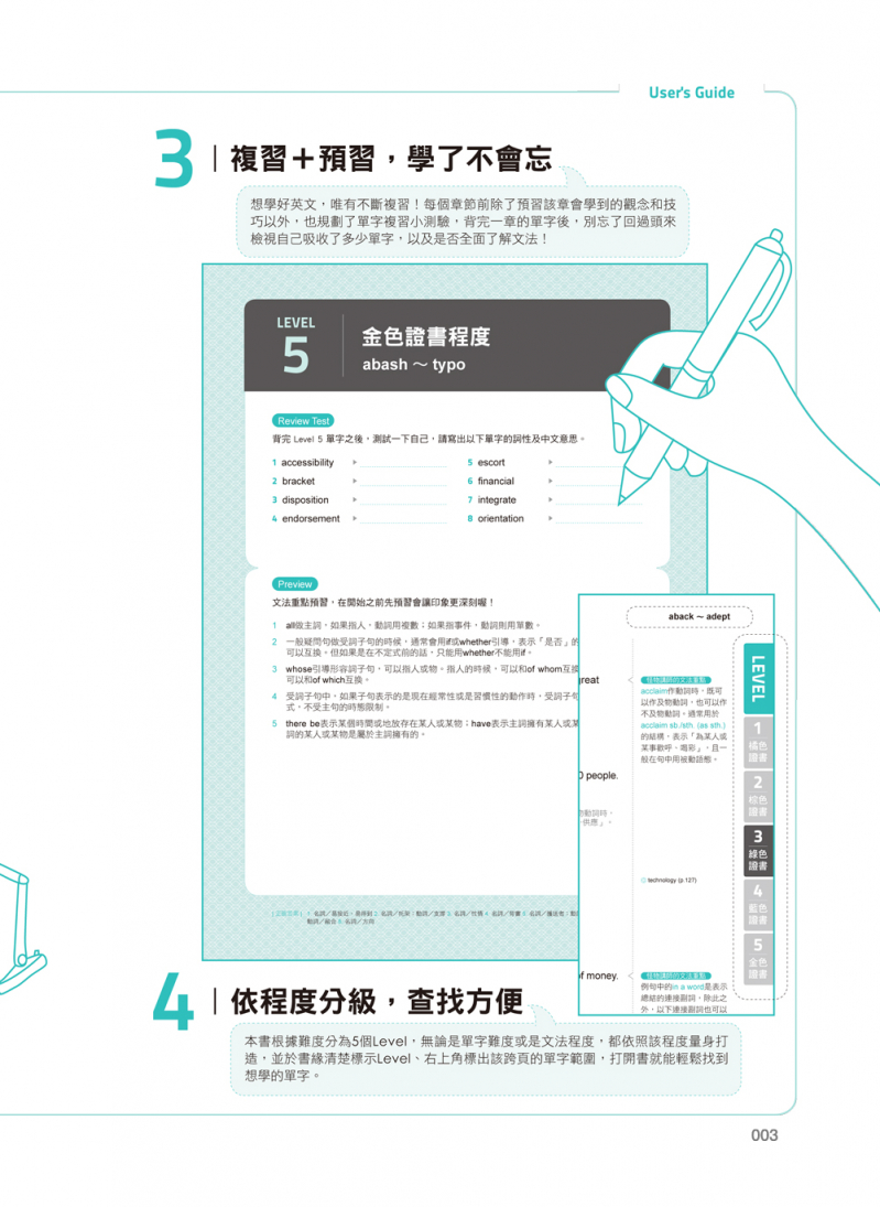 怪物講師教學團隊堅信,不斷地複習是成為英文高手的不二法門,為了幫助考生複習所學過的內容,書中也特別設計了「前尋後找」功能,只要翻書就能找到忘記的單字或是想加強複習的文法概念,透過一次次地複習,不但可以加深印象,也更能夠幫助自己檢視學習效果!