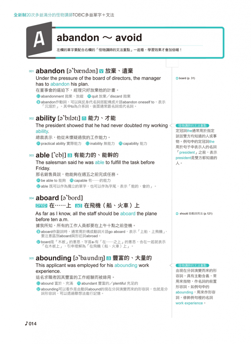 許多考生在準備多益考試時,不外乎是看參考書、多做試題等等,但在幾次赴日、韓參加多益考試的經驗中,我們發現多益考試中決勝的關鍵除了答題速度外,最困擾臺灣學生的就是考試中會出現的「同義字」,因此這次改版我們也特別為書中單字補充了同義字,幫助考生們能夠更快速地累積單字量,唯有增加單字量才能夠在答題時又快又好。當然,文法是任何英文考試中都不能忽略的部分,但是單獨學習文法是相當枯燥乏味的,因此怪物講師教學團隊特地設計單字搭配文法的學習方式,背完左欄的單字、看完例句的同時立刻學習相關文法,可以有效地整合資訊、提升學習成果。