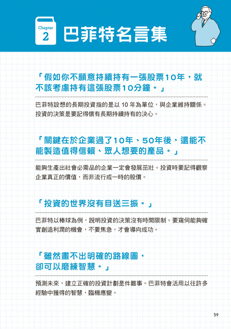 另外,巴菲特的教誨不僅止於投資。做生意也好,人生也好,都會提出絕佳的指引。那到底是什麼呢?——敬請各位慢慢期待。