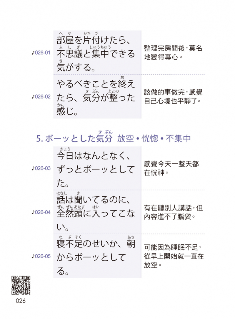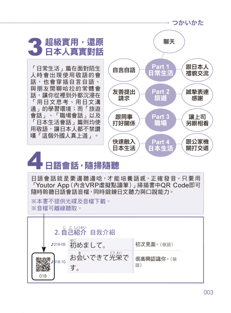 日語會話就是要邊聽邊唸,才能培養語感、正確發音。只要用「Youtor App(內含VRP虛擬點讀筆)」掃描書中QR Code即可隨時聆聽日籍老師的日語會話音檔,同時鍛鍊日文聽力跟口說能力。