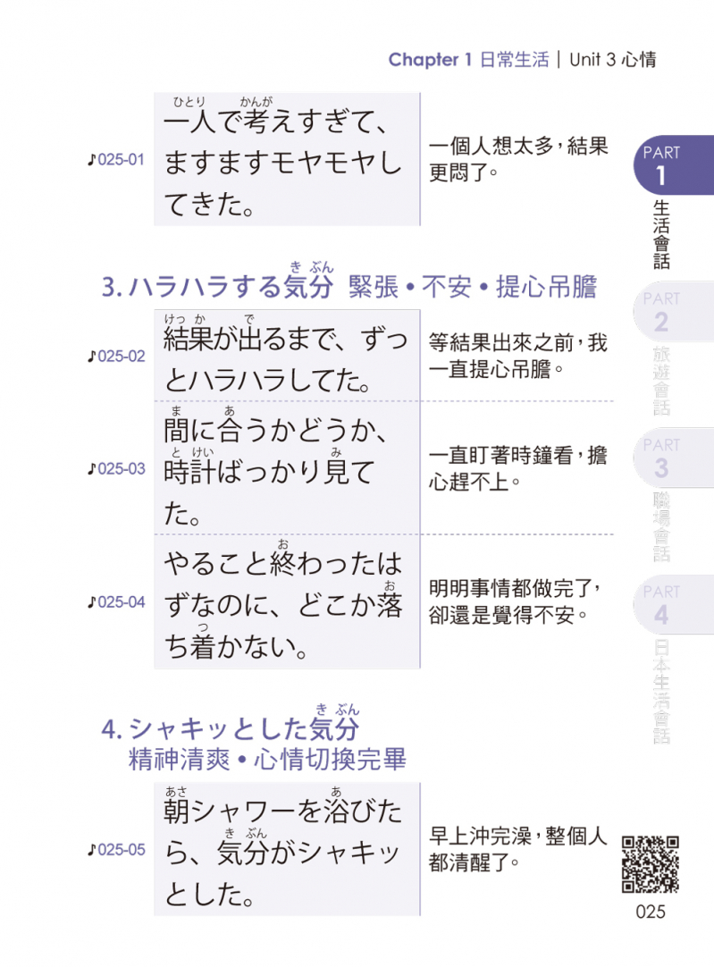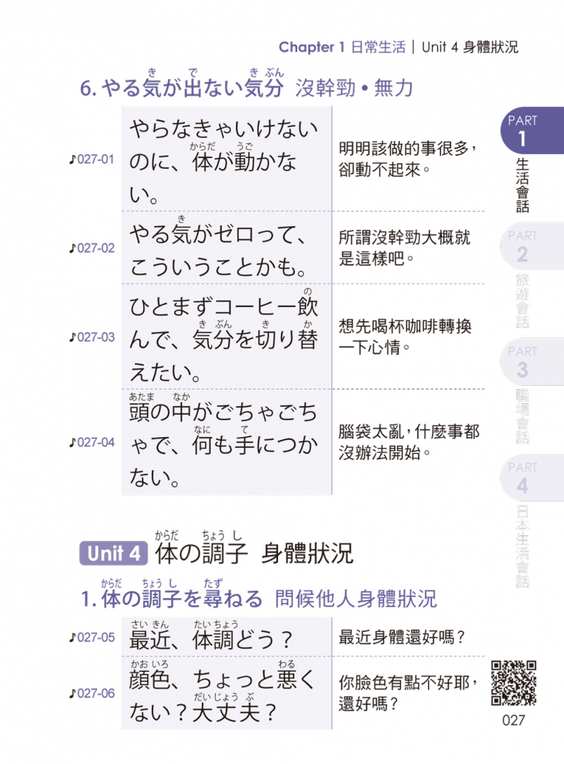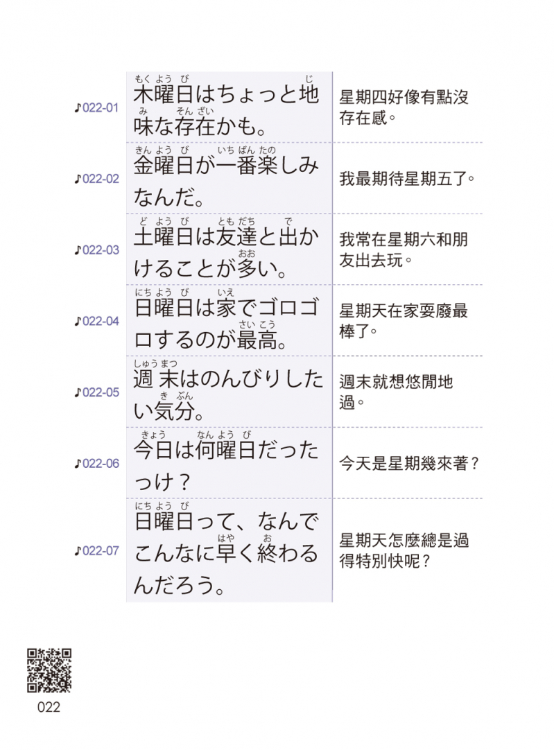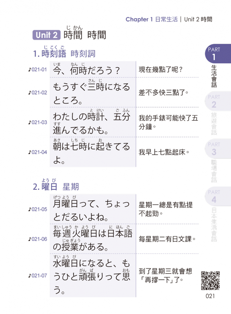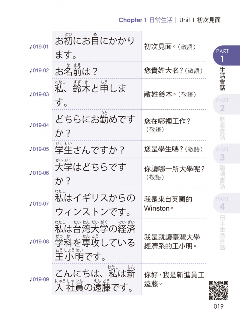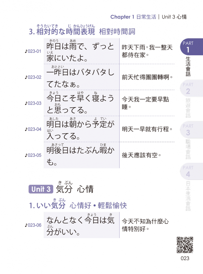 → 日常生活の会話篇 日常生活會話篇 (初次見面、時間與星期、心情、身體不適、每日的日常生活)