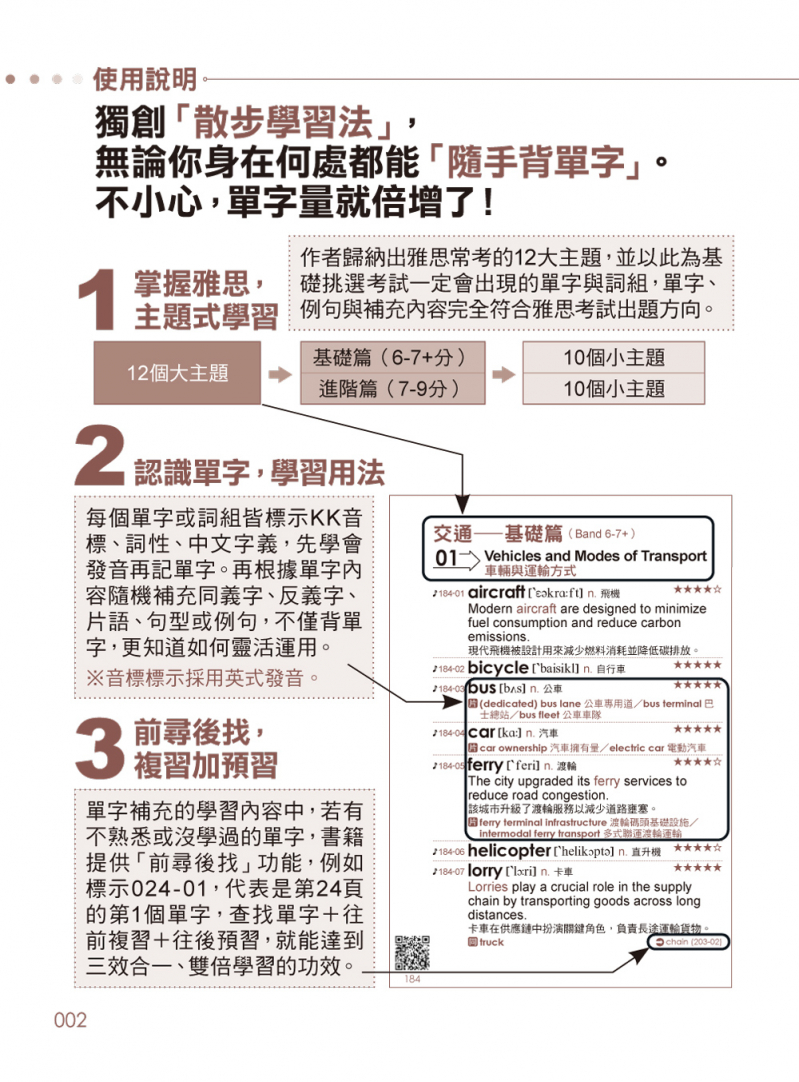 利用「散步學習法」,無論你身在何處都能「隨手背單字」。全書收錄雅思IELTS測驗中出題頻率最高的3,600單字,先將單字分成12大主題,再依據目標分數分成「基礎篇(6~7分)」與「進階篇(7~9分)」,每一篇再細分成10個小單元,便於準備雅思考試的考生分門別類的記憶並學習。