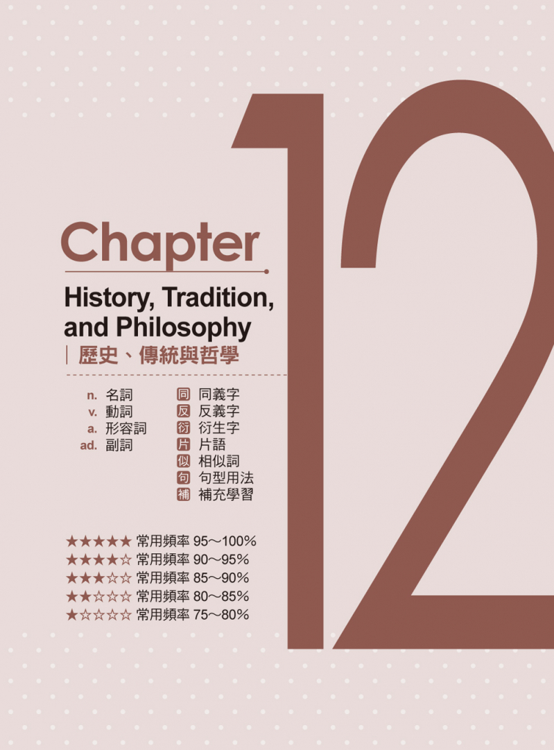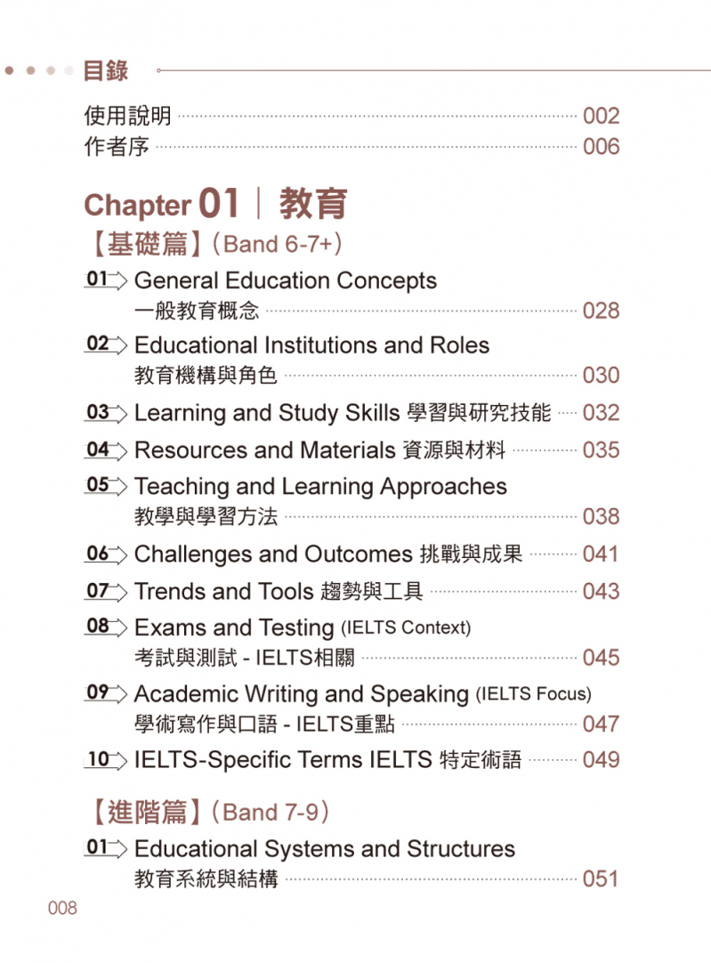 全書依照雅思IELTS常考主題分類成12大主題,再依據目標分數分成基礎篇與進階篇,如果目標分數是6~7分,基礎篇的單字一定要會;想要進階挑戰7~9分,就要多加練習進階篇的單字。