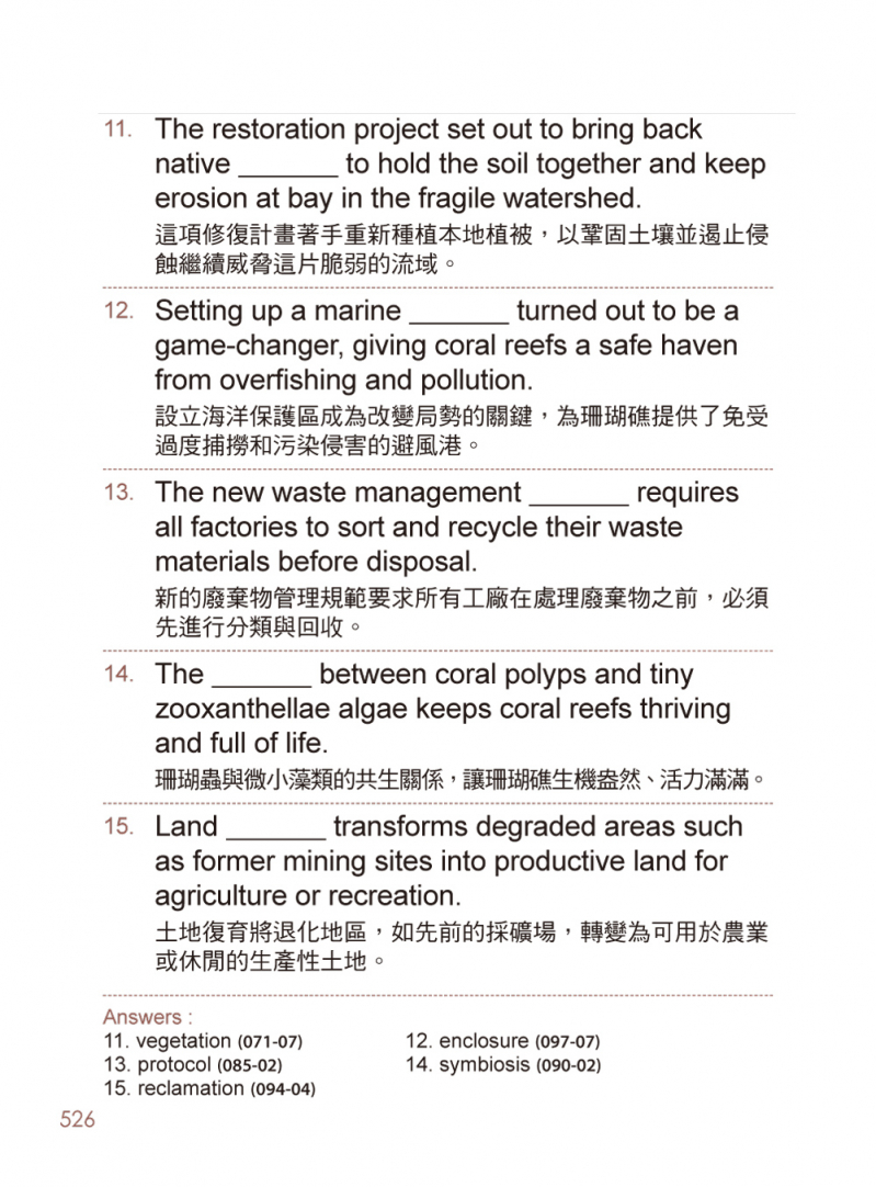 背完雅思單字後,可以翻到最後練習雅思單字填空題,且題目以單字的例句為基礎,除了能測驗單字是否熟記外,也能順便複習之前學過的內容。