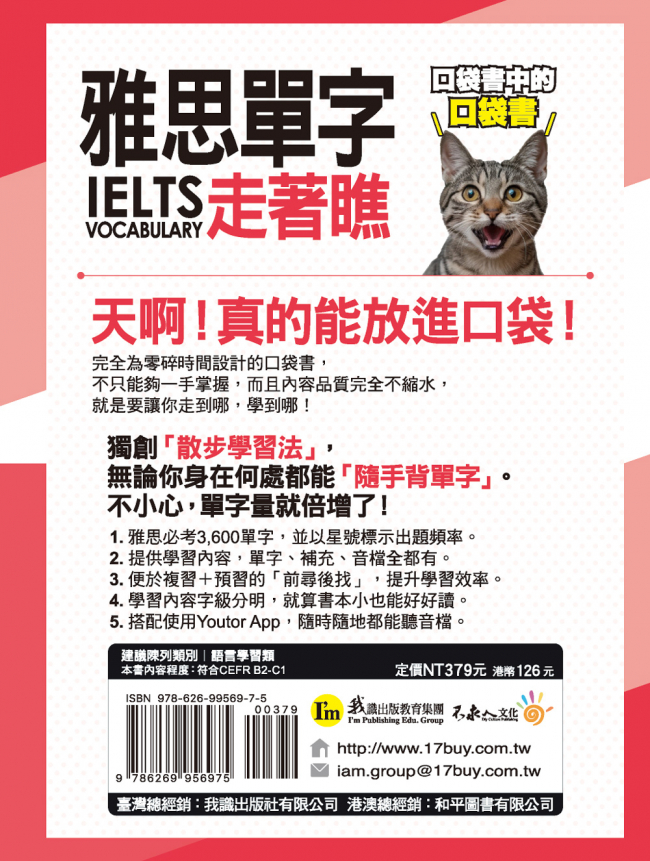 坊間標榜的口袋書,往往都是大大的一本,根本放不進口袋。要不就是為了能放進口袋,而縮減了該有的內容。《雅思IELTS單字走著瞧》為想要利用零碎時間學好英文的人量身打造。小歸小,一樣可以五臟俱全!
