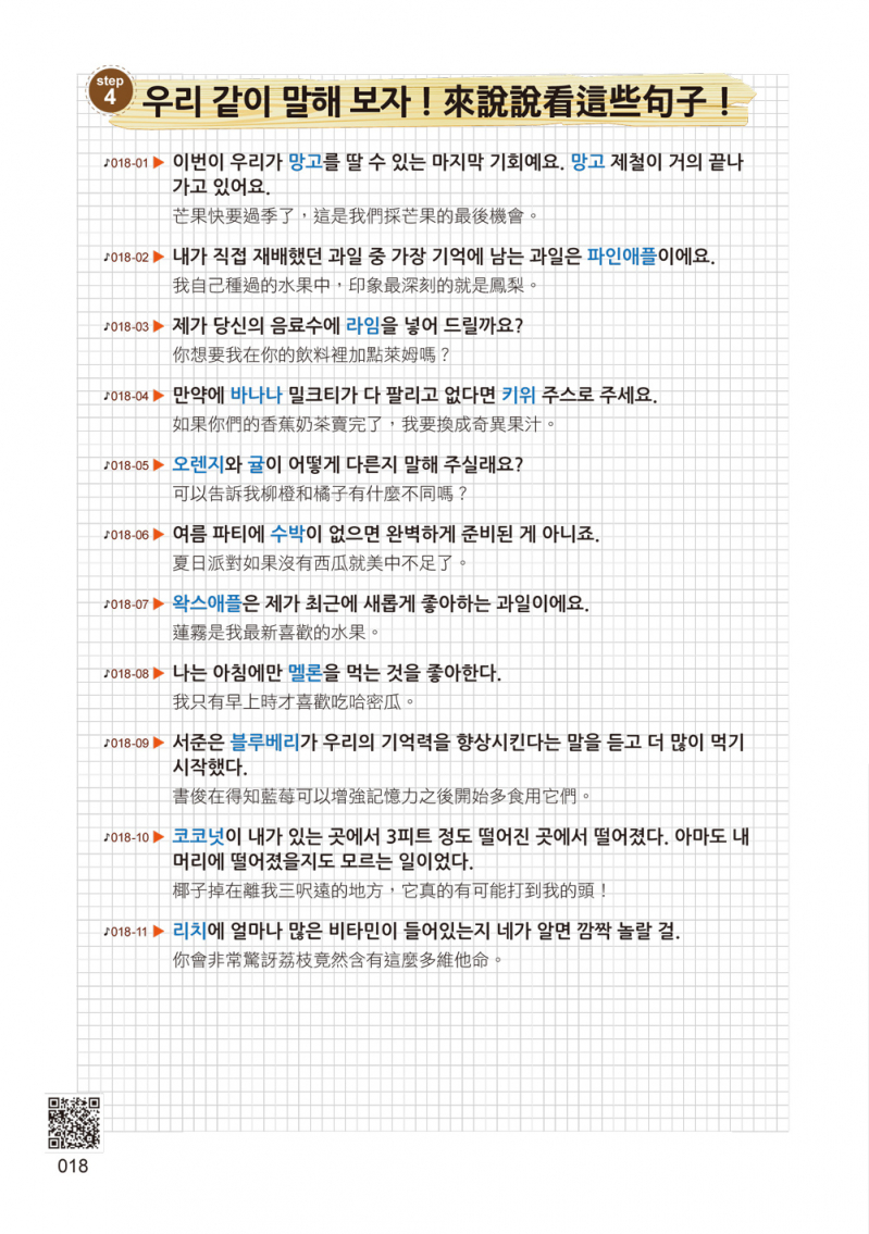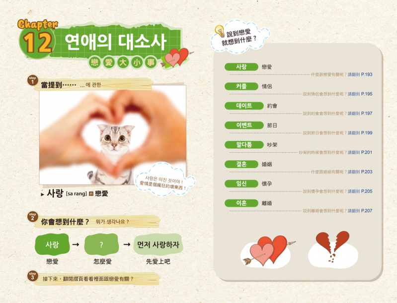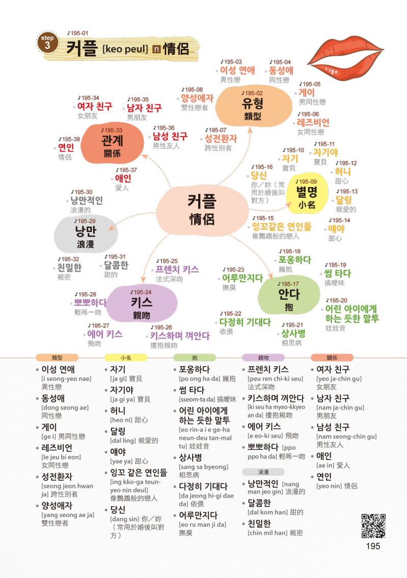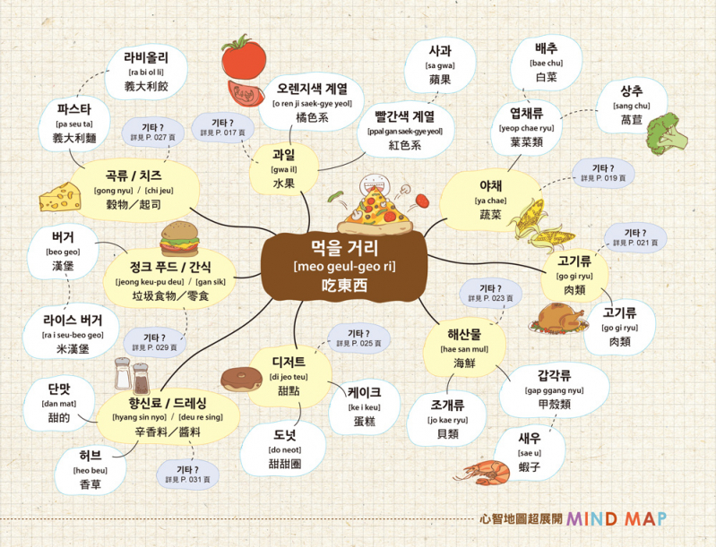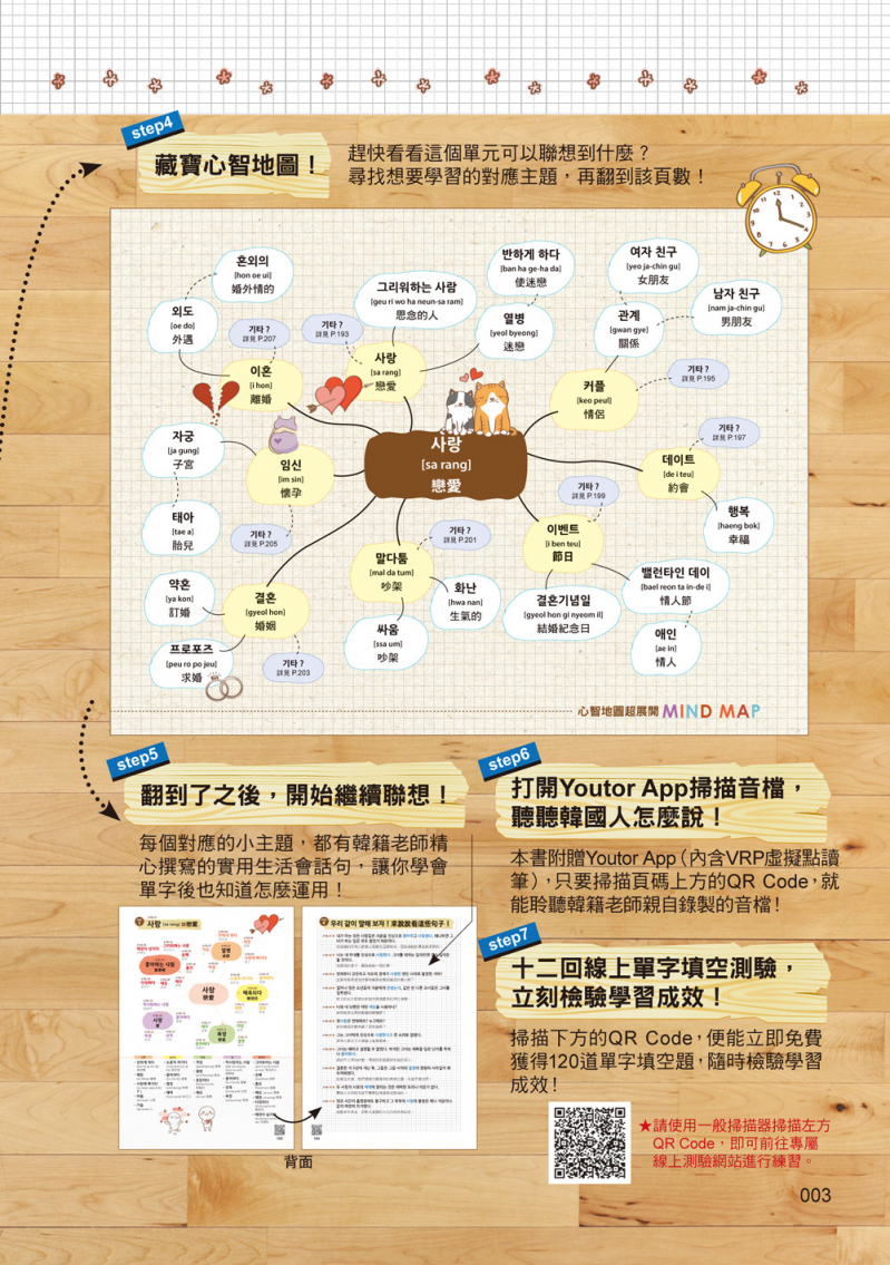 主題聯想→動動手指→學習會話→無限延伸→聽音檔複習 Step1主題聯想 先訂定主題,例如看到「吃東西」,你有什麼想法呢?吃水果?吃海鮮?加調味料?腦中有沒有漸漸浮現一些相關的內容呢? Step2動動手指、翻開拉頁 快動動手指翻開對應的單元,看看有哪些單元中的單字是剛剛有想到的,又有哪些是被遺忘的呢? Step3學習會話 單字學了就是要會用,不然根本就白學了!熟悉單字之後來看看要如何將單字靈活運用在會話中吧! Step4無限延伸 在單元中若有聯想到其他的單字就立刻寫下來,將心智圖無限延伸,壯大你的單字庫。 Step5聆聽音檔,加深印象 書中的每個單字及例句皆有韓籍老師親自錄製的音檔,只要在手機下載「Youtor App」(內含VRP虛擬點讀筆)掃描QR Code 即可聽取。只要有書+手機,隨時都能輕鬆學韓文。