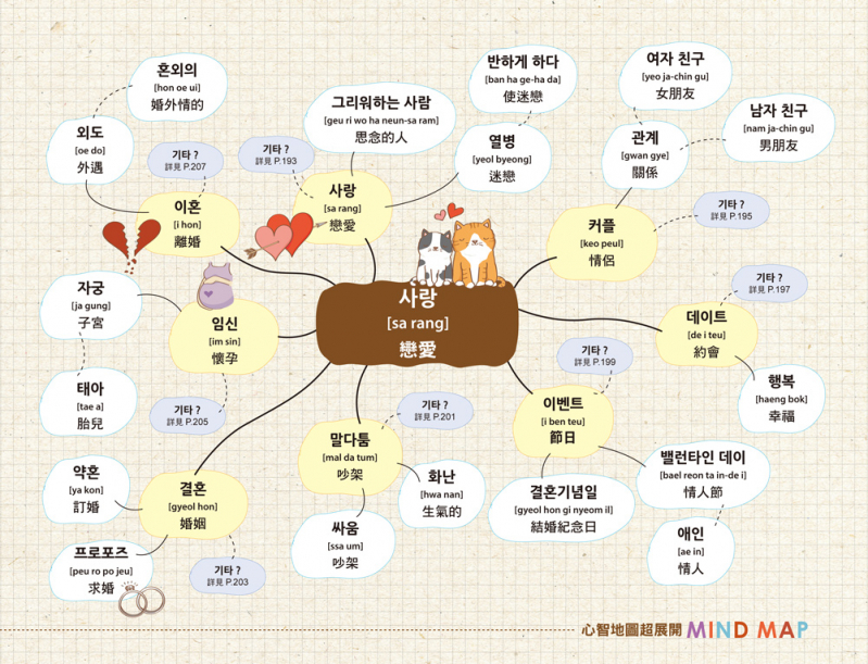 ★17張心智地圖拉頁 根據心理學家的研究:若透過心智地圖的歸納及整理,便能有效將資訊放進長期記憶中,臨時需要時即可快速從中搜尋,擺脫以往的填鴨式記憶,讓腦中訊息不再像是垃圾堆般雜亂無章。 ★5,000個單字一定用得到 由17張心智圖拉頁延伸出5,000個單字,每一個單字都是生活中一定用得到的,從生活中學習最有效率!因為一定用得到,所以絕對要學好!這5,000個單字一定夠你在韓國走跳! ★超道地韓語會話句 不同於坊間的單字書,會話句總是無聊、不實用,本書的每個主題都有由韓籍老師精心撰寫的實用會話句,讓你學會單字後也能懂得靈活運用於會話句中。 ★專家講解心智圖教學課程