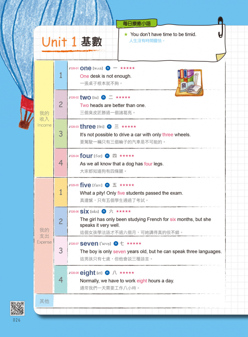 本書將英文書寫情境分為三大方向「用英文記錄數字與單位」、「用英文寫下生活中的人、事、物」、以及「用英文表達心情與感想」。不論是記錄行程、生活片段,還是寫下當下的感受與想法,你都能在手帳裡找到適合的英文句型,讓英文成為你生活紀錄的一部分,而不是額外的學習負擔。
