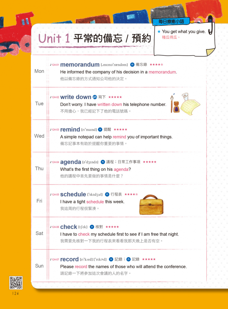 從商務金融、家電用品、服飾搭配到心情記事,本書精選60個最日常、最能寫進手帳裡的英文情境。透過「手帳式書寫練習」,你每天都能像記錄生活一樣,用英文寫下一句當天的感受、行為或想法,讓語感自然在你的生活節奏中累積起來。