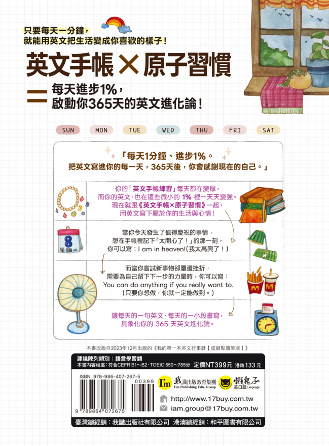 本書以「行事曆」為學習核心,將每天化成一個「英文微行動」。不需補習、不用死背,只要每天1分鐘、進步1%,就能啟動365天的英文進化論,透過日復一日的紀錄與書寫,你會逐漸建立自己的語感節奏,讓英文在生活中自然成長。。