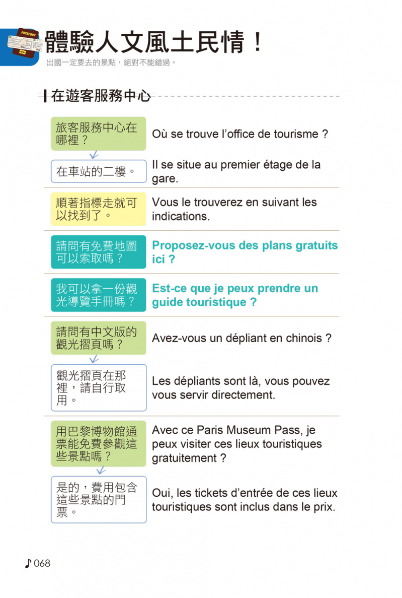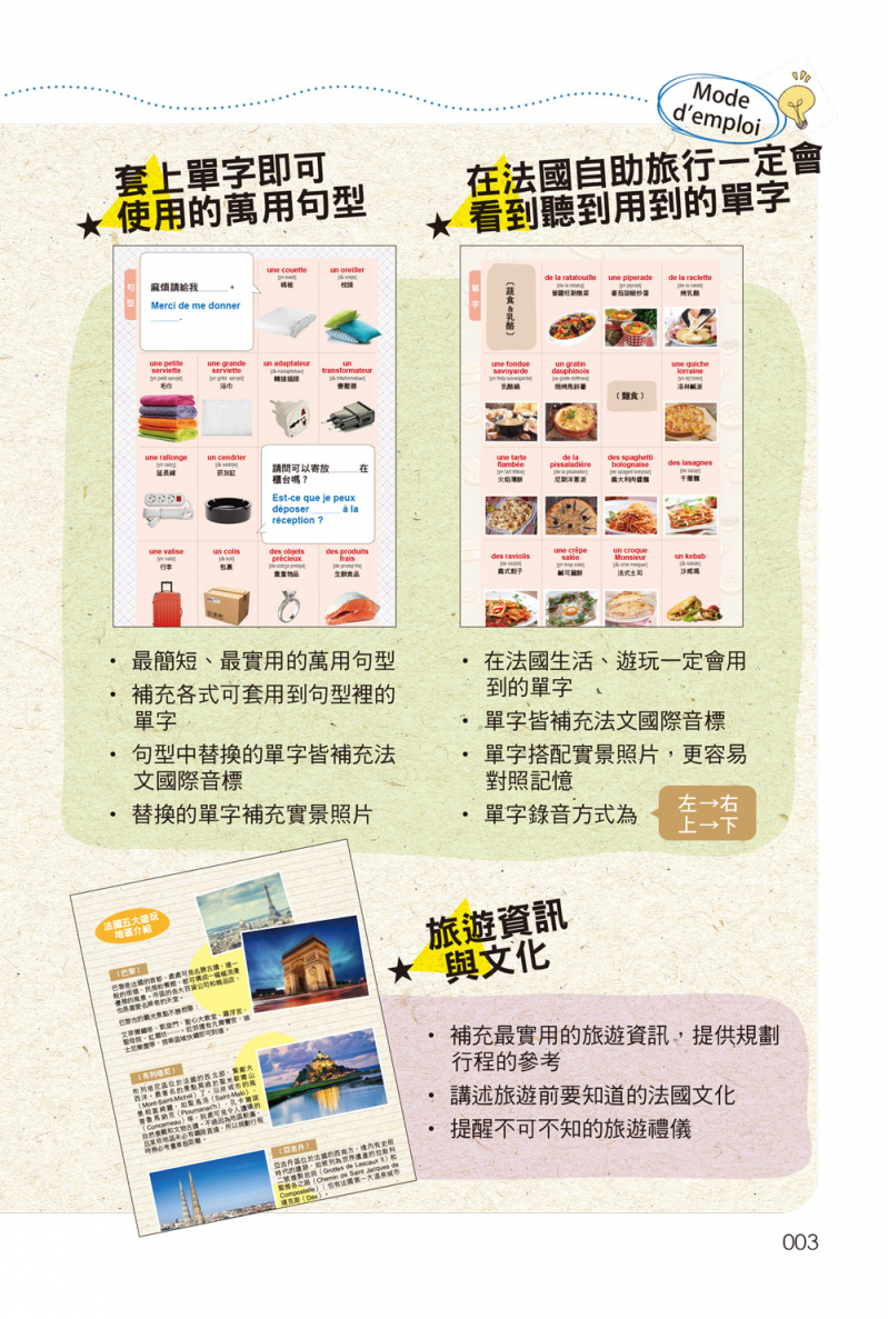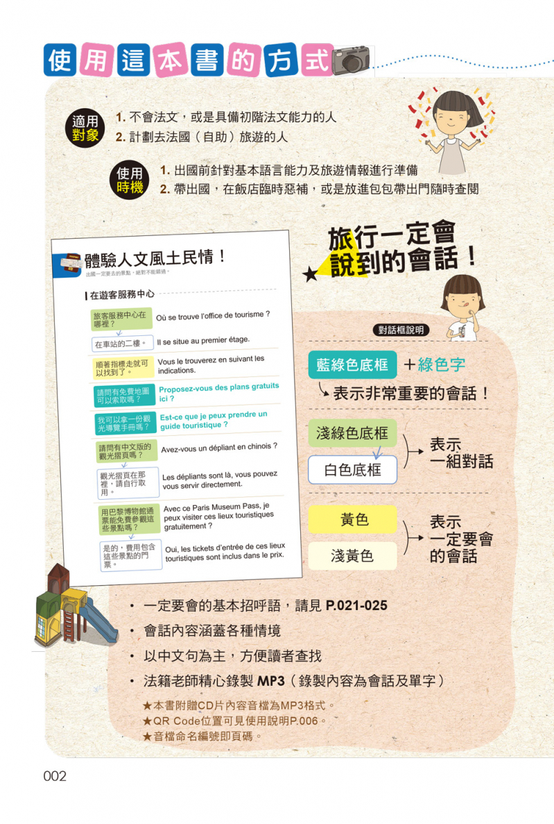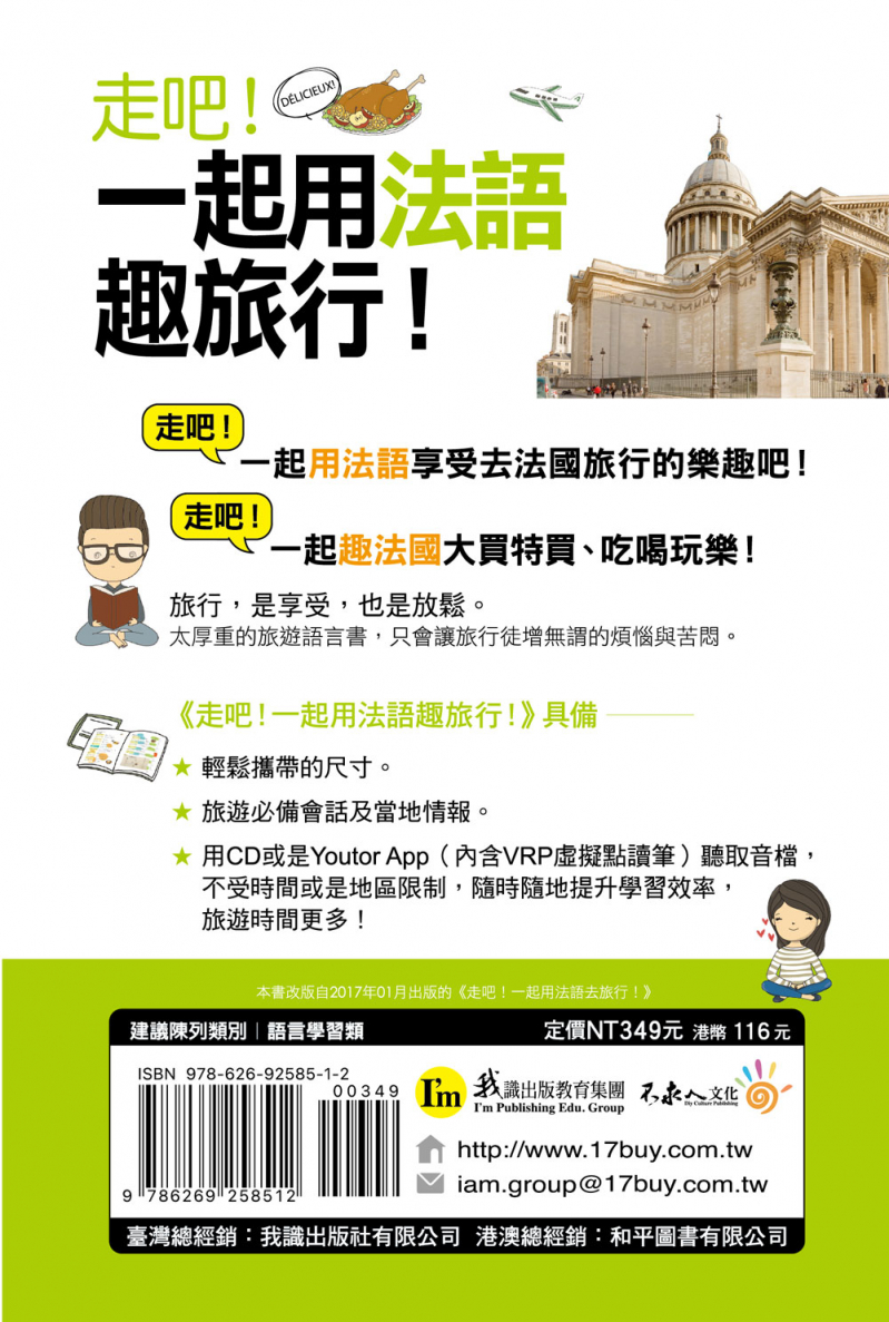 《走吧!一起用法語趣旅行!》具備 1. 輕薄的尺寸大小,好攜帶不佔位。 2. 沒有太多的廢話,只有旅行一定會說到的會話。 3. 萬用句型及常用單字,搭配實景照片,使用更方便。 4. 結合語言書與旅遊書的特色,補充各種旅行注意事項。 5. 用CD或是Youtor App(內含VRP虛擬點讀筆)聽取道地法文音檔,