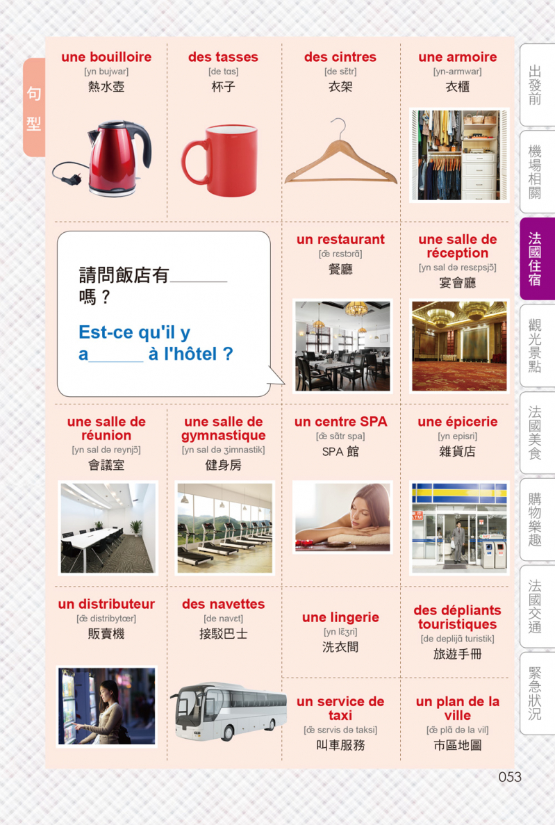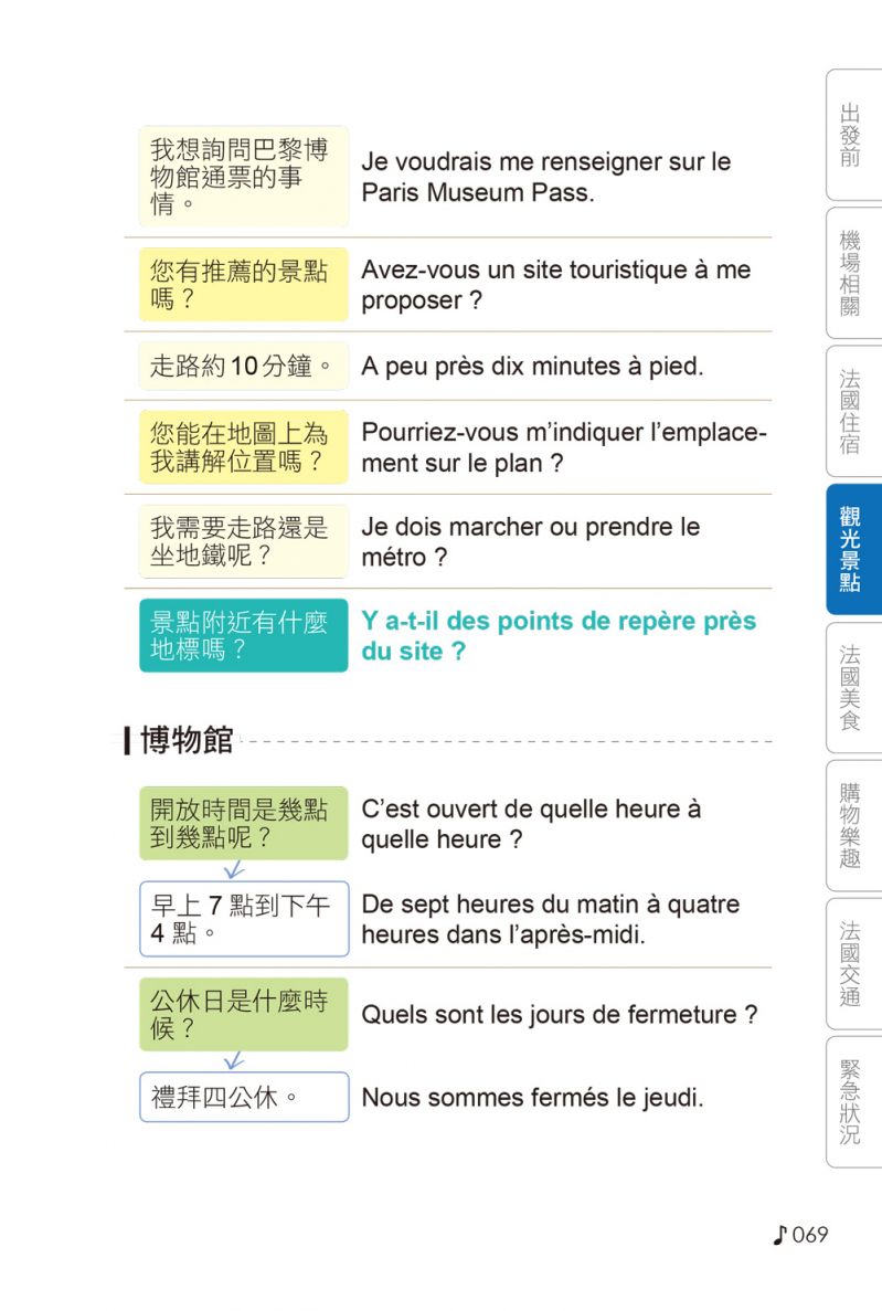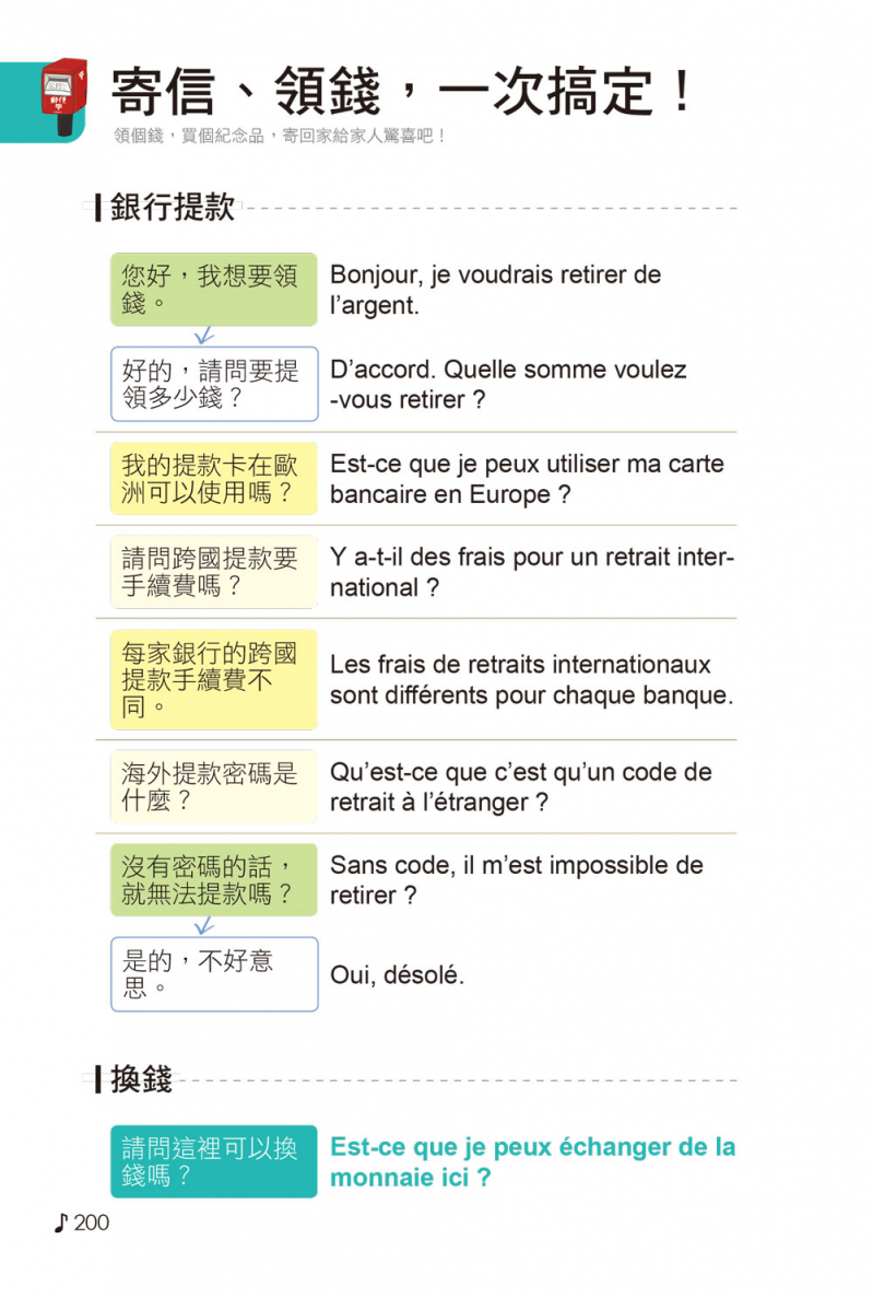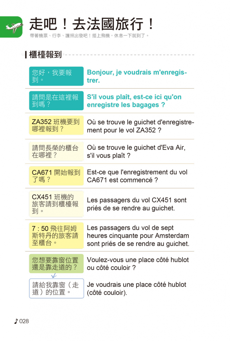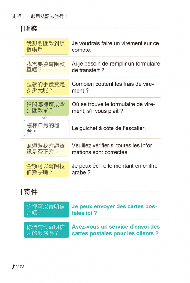《走吧!一起用法語趣旅行!》具備 1. 輕薄的尺寸大小,好攜帶不佔位。 2. 沒有太多的廢話,只有旅行一定會說到的會話。 3. 萬用句型及常用單字,搭配實景照片,使用更方便。 4. 結合語言書與旅遊書的特色,補充各種旅行注意事項。 5. 用CD或是Youtor App(內含VRP虛擬點讀筆)聽取道地法文音檔,