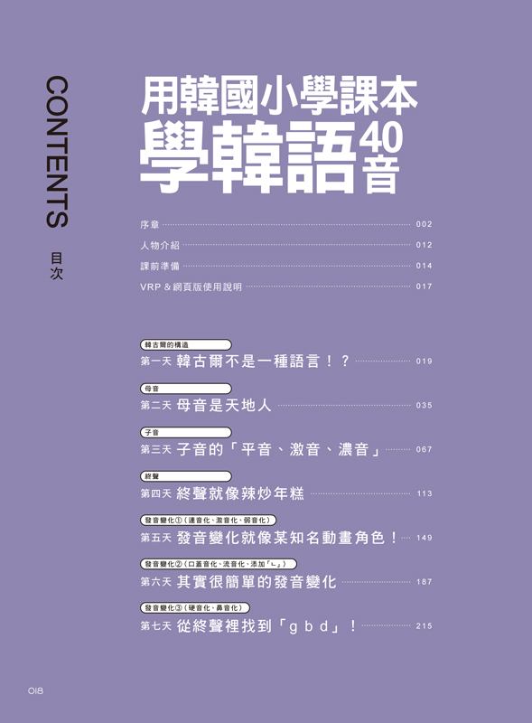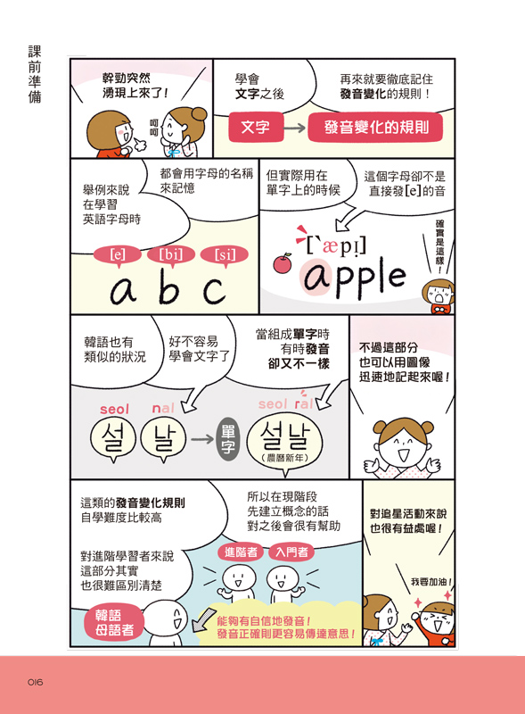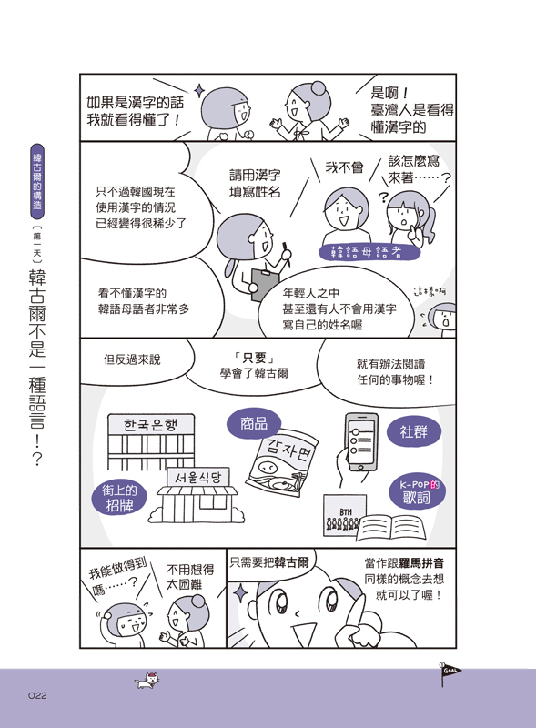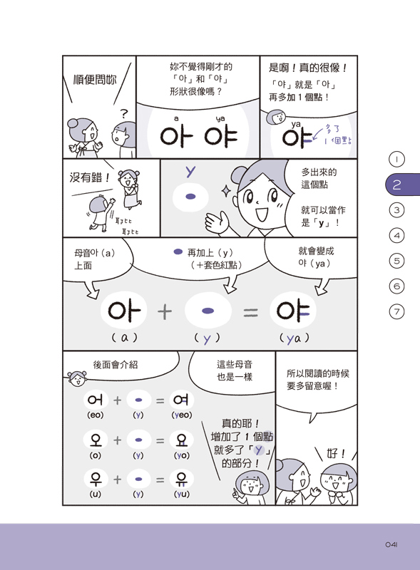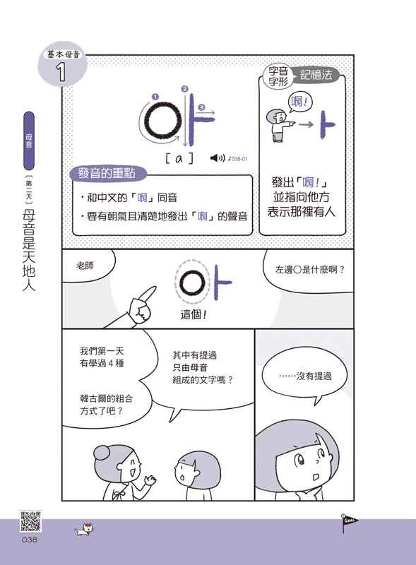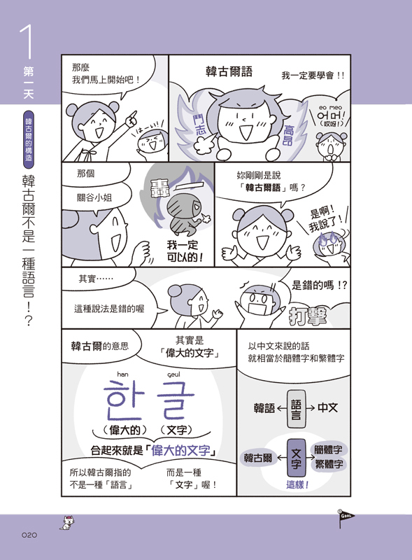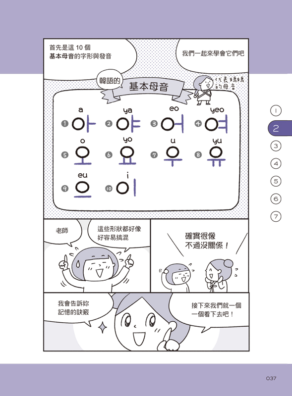 用漫畫說故事的方式,7天輕鬆學習韓語40音的源起、母音、子音、終聲和發音規則。每看完一個章節,就好像上完一堂輕鬆的小學韓語課!