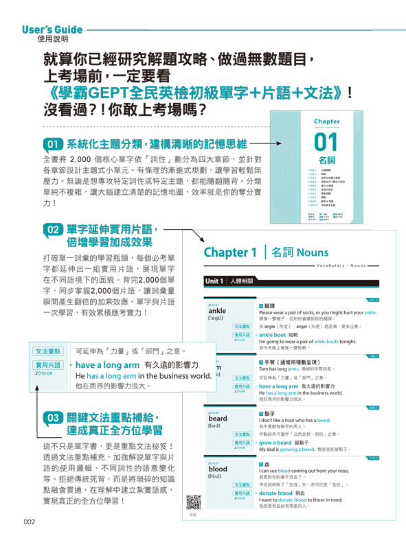 本書更打破「單字歸單字、文法歸文法」的學習屏障,在每個精心編寫的例句中,直接嵌入重點文法,讓你在理解單字時一併掌握文法規則,這種同步內化的方式,不僅能大幅減輕分開背誦的心理負擔,更能讓學習效率翻倍提升,達成零失誤備考,讓基礎功紮實得無懈可擊!