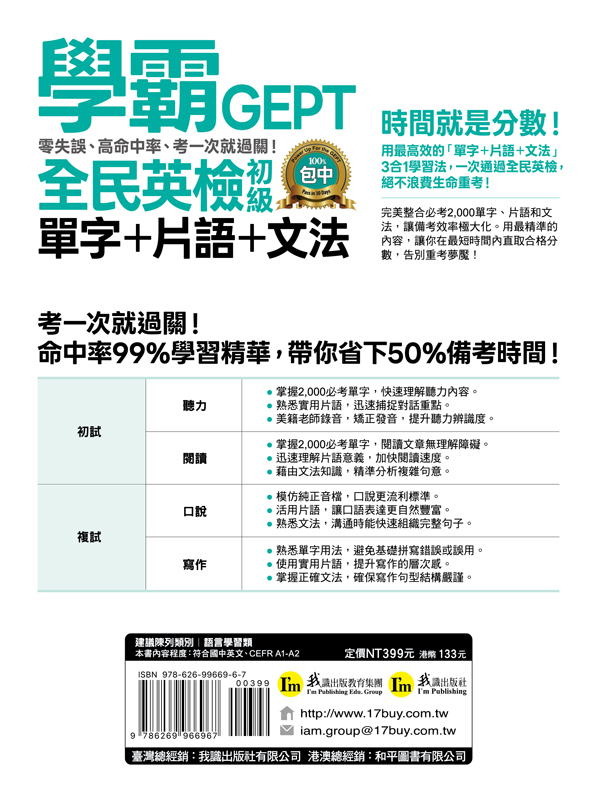不僅完美濃縮所有備考要素,整合必考的單字、片語、文法,更能同時強化聽讀說寫四大能力。無論是檢測基礎的初試,或是考驗應用的複試,一本就能提供完整支援,免去購買多本教材的負擔,幫你省錢、省力,一次過關!