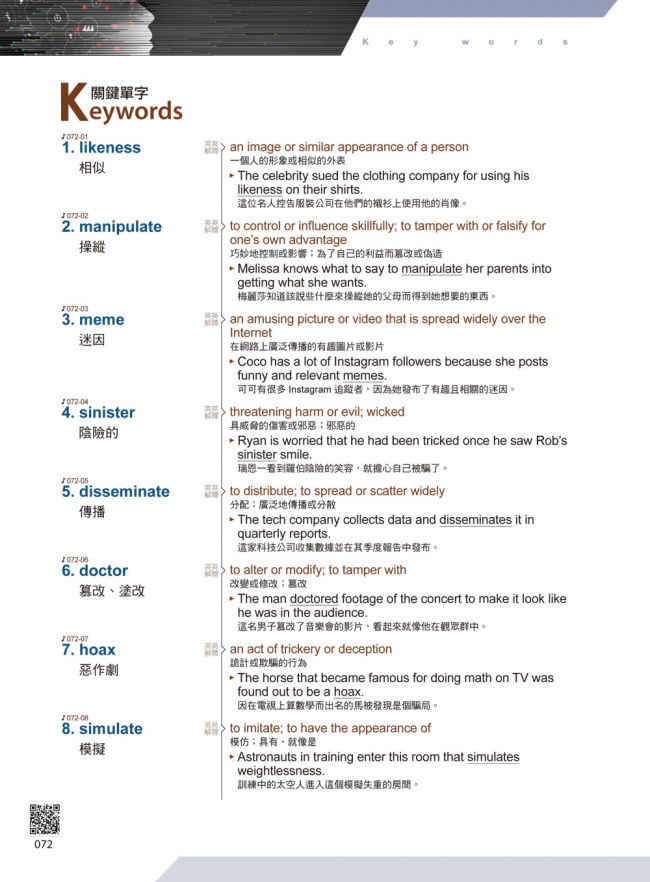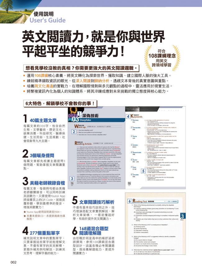 每篇文章、每個例句都由美籍老師獻聲錄音,可以同時訓練英語聽力。只要使用Youtor App掃描書頁上的QR Code,就能反覆聆聽本書的英文文章與例句,學到最標準的發音,增強英聽實力!