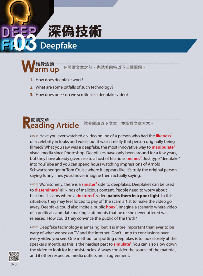 除了閱讀文章之外,也可以使用免費下載的Youtor App(內含VRP虛擬點讀筆)掃描頁碼旁QR Code聆聽美籍老師朗讀文章與例句的音檔,就能同時訓練英語聽力與口說力。