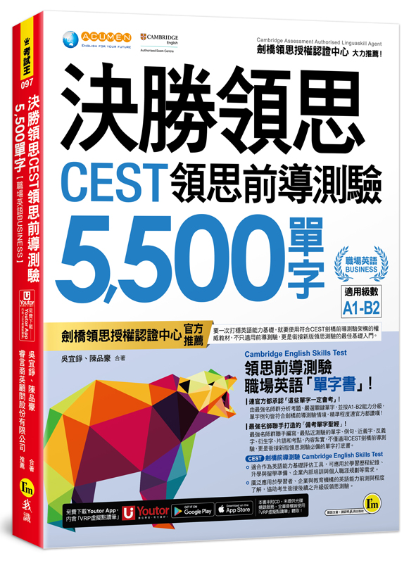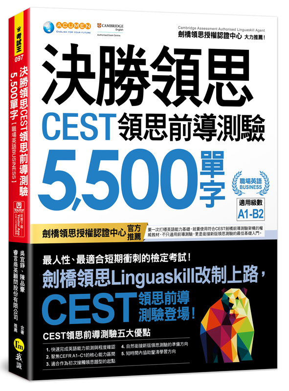 劍橋領思英語檢測(Linguaskill)是相當新穎且與眾不同的英文檢定考試,其最大的優點是可以立刻知道成績、省去等待的時間。而為了幫助考生在進入正式考場前能有更精準的練習方向,我們特別將原有的職場單字教材重新編修,推出了這本《決勝領思CEST領思前導測驗5,500單字【職場英語Business】》。