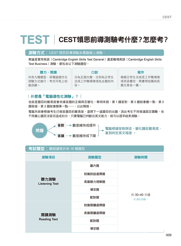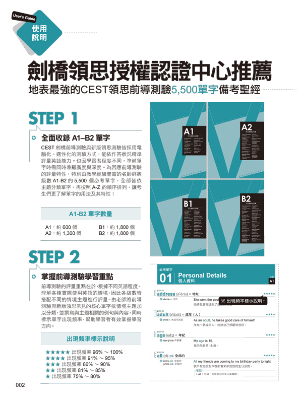 另外,劍橋領思英語檢測(Linguaskill)是適性化測驗,會根據考生的程度調整下一題的難易度,因此只需要花很少的時間,就能做完試題。本書針對這種測驗特性,特別強化了單字的深度與廣度,讓程度好的考生便能直接挑戰難度高的題目、輕易地拉高分數。有如此方便、有效率、有鑑別度的測驗與對應教材,我才能在課堂上鼓勵許多忙碌的高中生、大學生在提升自我英文能力的同時,也能善用時間,收集更多的證書、檢測自己的英文實力。