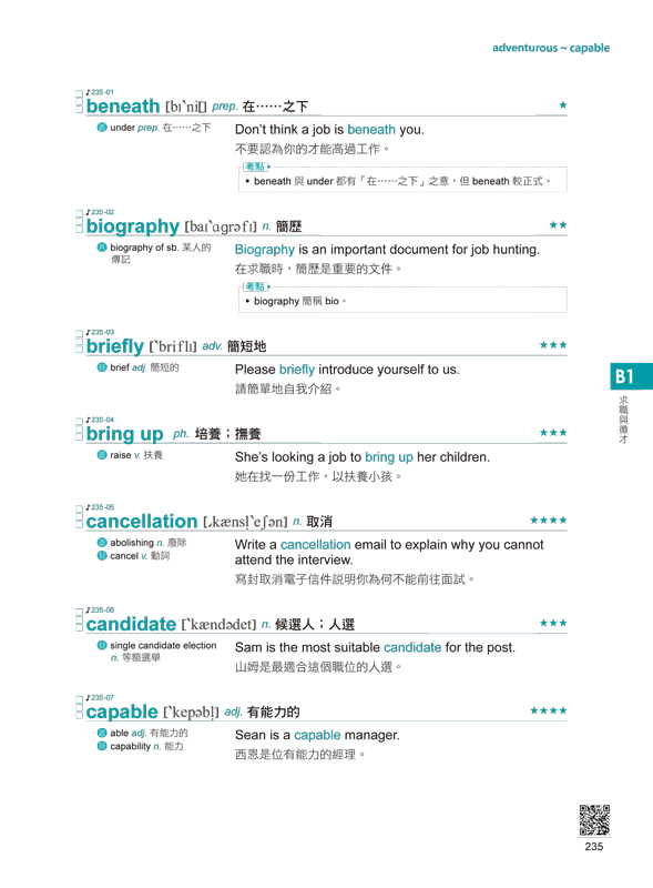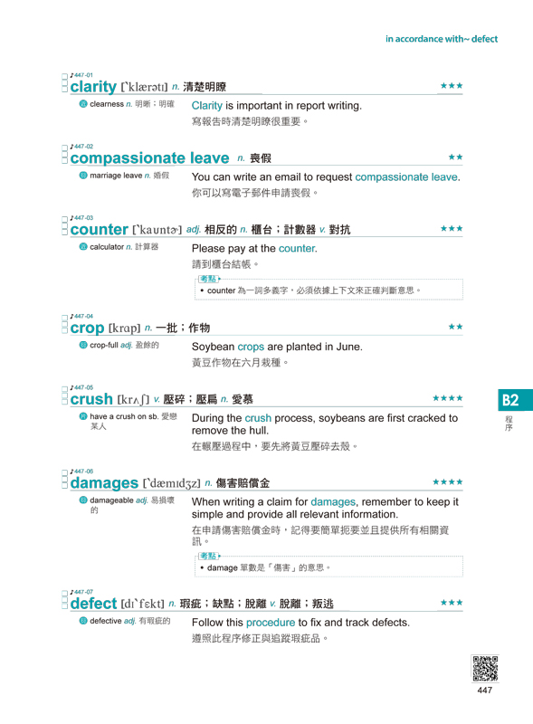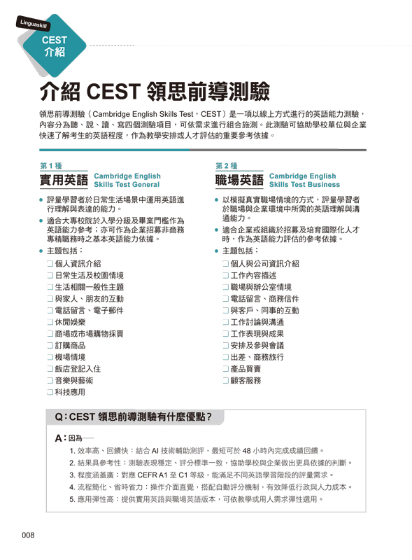 尤其是在職場上,會出現專有名詞、有多種 email 書寫模式,更包含特殊的行話等,要釐清這些用語及用字,這本由原版《決勝領思Linguaskill 5,500 單字》全面升級改版的《決勝領思CEST領思前導測驗5,500單字【職場英語Business】》,絕對可以幫助讀者在學完一個單字後,馬上實際應用在各個職場情境中,也透過前導測驗的邏輯引導,讓你實際應用之後,牢記在心中。