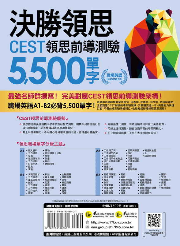 以貼近真實日常生活與職場溝通情境為特色的英語能力評量,自在臺灣推行以來,學習者對測驗難易度的感受各不相同;然而,無論覺得簡單或困難,最終仍取決於自身的英語能力與準備方向是否正確。在測驗制度進入改制階段、前導測驗正式推出的現在,選擇一本合適的學習工具書,更顯得格外重要。本次改版後的《決勝領思CEST領思前導測驗5,500單字【職場英語Business】》,以CEFR A1–B2為編排核心,依照不同情境主題系統化整理詞彙,從基礎能力建立到中階實用程度,協助學習者循序漸進地累積單字實力,並自然銜接新版領思測驗的準備需求。
