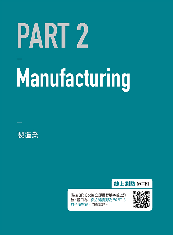 掃描各單元篇章頁QR Code進行單字線上測驗,測驗題目為「多益閱讀測驗PART 5句子填空題」仿真試題。(用手機一般QR Code掃描器掃描)