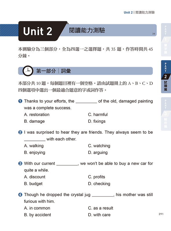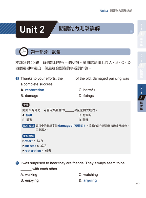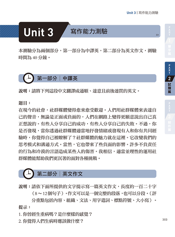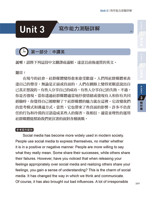 針對PART2的模擬試題,逐題附上「滿分解析」,協助讀者在核對答案的過程中釐清題目中的文法考點,對於複試的口說及寫作測驗,亦補充實用的作答技巧。