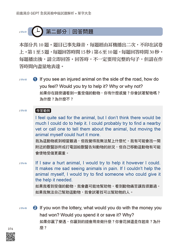 收錄全民英檢中級「初試 + 複試」完整擬真試題一回。瞭解考試題型並依照正式考試的作答時間,實際進行一次模擬測驗,從中找到自己需要加強的環節。