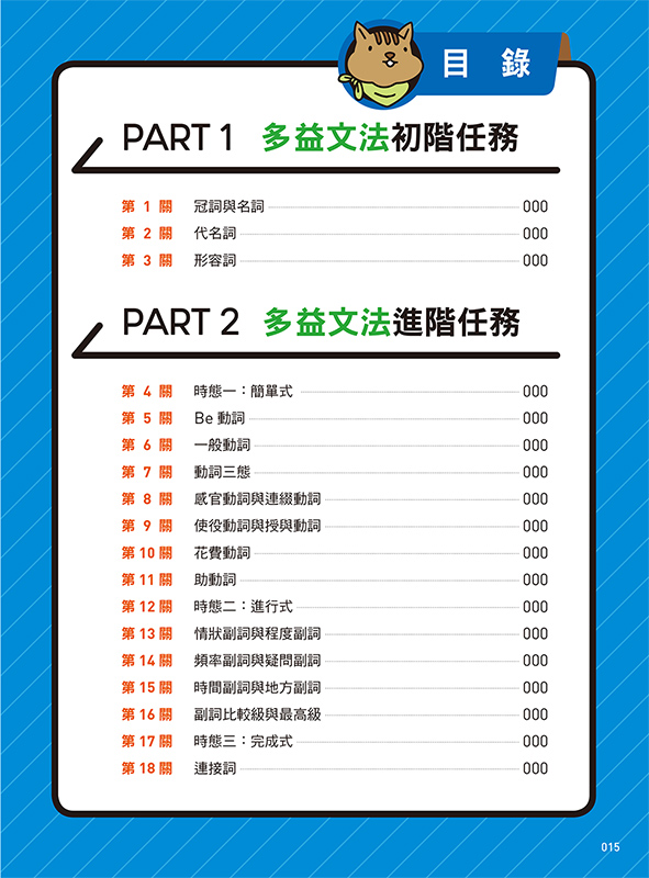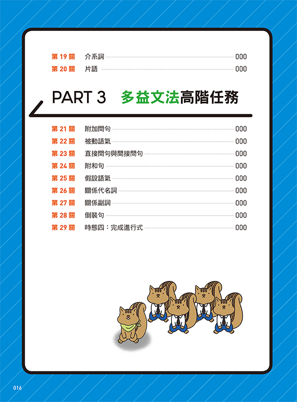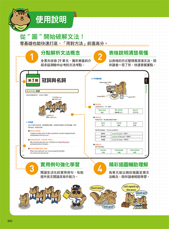 每單元皆以精彩插圖呈現文法概念,陪伴讀者透過圖像記憶,讓文法觀念深植腦海。