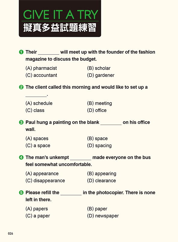 每單元皆附10題多益擬真文法考題,出題方式參考多益閱讀測驗Part5句子填空。
