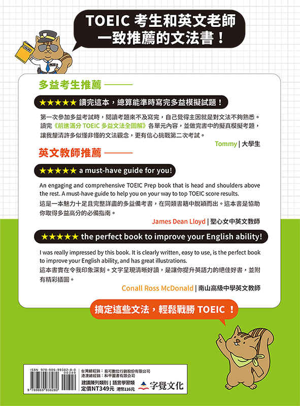 第一次參加多益考試時,閱讀考題來不及寫完,自己覺得主因就是對文法不夠熟悉。讀完《前進滿分TOEIC多益文法全圖解》各單元內容,並做完書中的擬真模擬考題,讓我釐清許多似懂非懂的文法觀念,更有信心挑戰第二次考試。