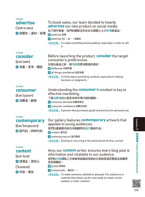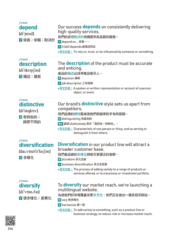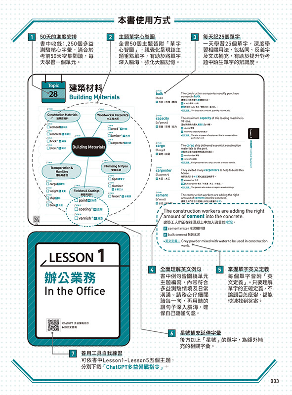 搭配25個多益核心單字及其例句。這些例句不僅緊扣單元主題,更能讓你集中精神,深度學習該字的用法。同時,這本書還提供了