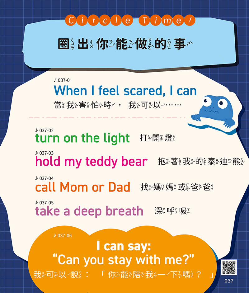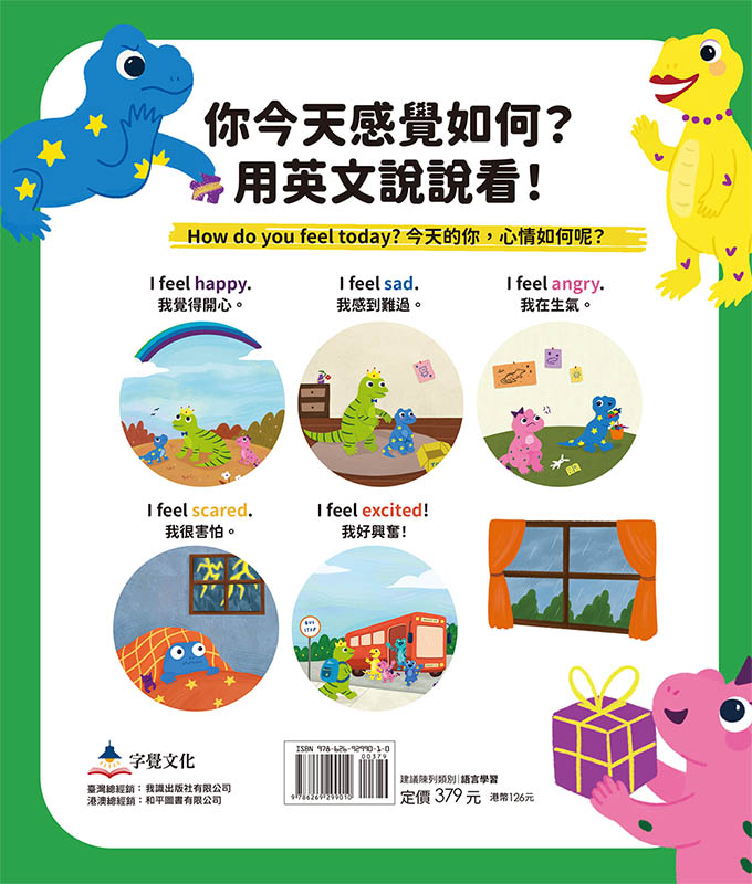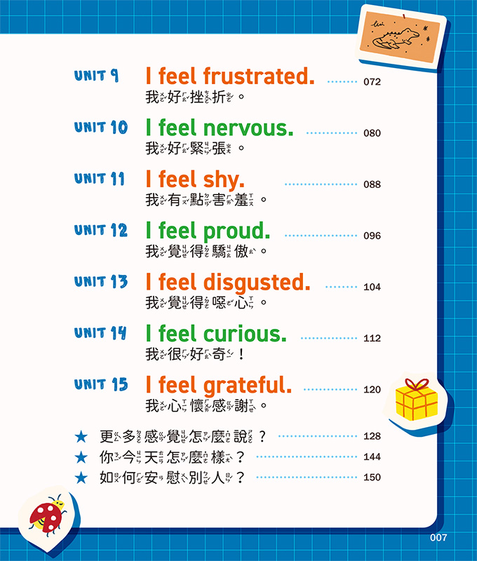 收錄孩子最常遇到的15種情緒,透過情境插圖與簡單句型,鼓勵孩子用英文說出自己的感覺,例如 I feel happy.、I feel angry.。