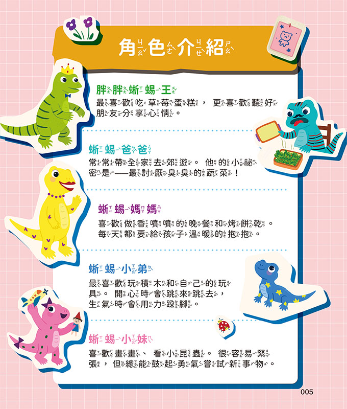 ◆利用書中蜥蜴角色的表情和動作,先引導孩子「指一指、說一說」:這是開心?還是難過?爸媽可以陪伴孩子聆聽音檔、跟讀句型,建立英語語感,也讓孩子認識不同情緒的名稱。例如:Happy(開心)、Sad(難過)。