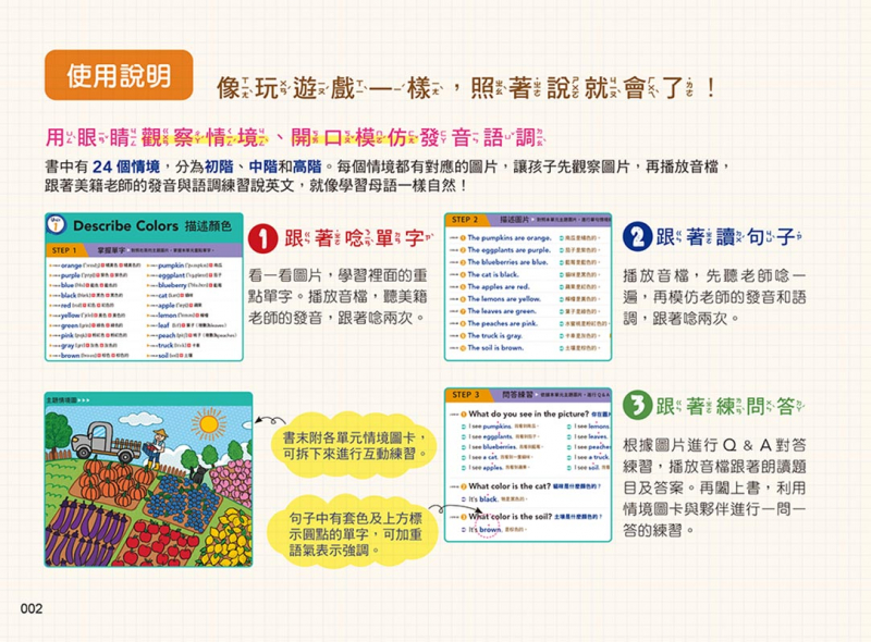 書中有24個情境,分為初階、中階和高階。每個情境都有對應的圖片,讓孩子先觀察圖片,再播放音檔,跟著美籍老師的發音與語調練習說英文,就像學習母語一樣自然!