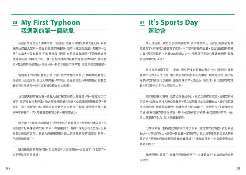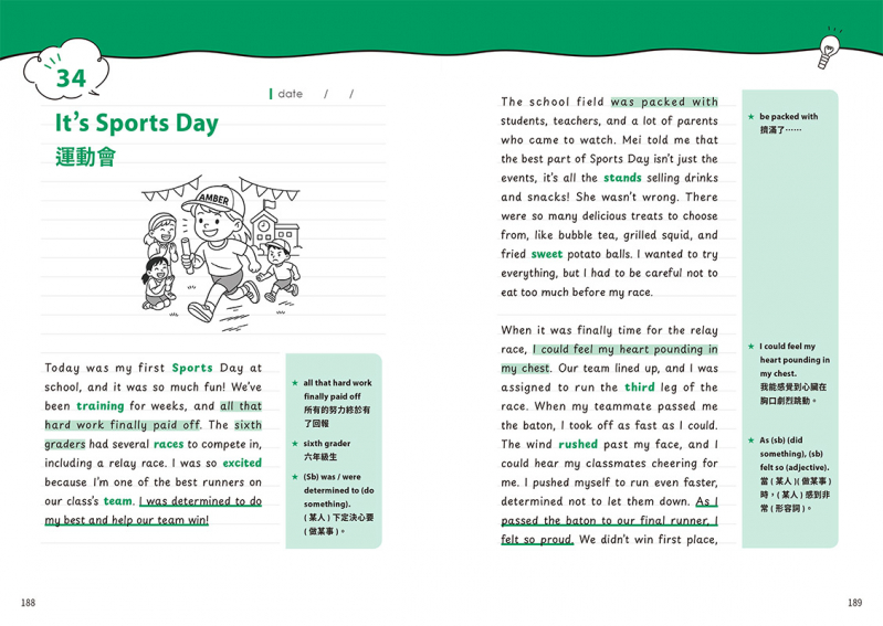 每篇日記都包含了文法重點。我知道,你現在心裡可能在說:「文法好無聊。」但文法真的很重要,所以書裡會提供一些你可以練習的例子。
