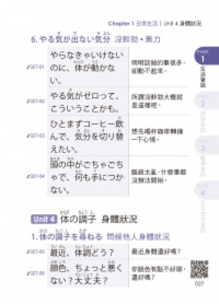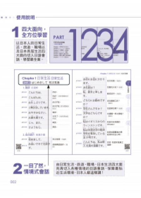 ● 日常生活篇:讓你在便利商店、校園、朋友聚會都能對答如流。遇到陌生人要用敬語,跟朋友哈啦就用常體,甚至還有自言自語的表達,讓你「裡外都像日本人」。 ● 旅行篇:帶你從機場到觀光景點都能用敬語應對,買票、問路、吃美食不再手忙腳亂。 ● 職場篇:專門為要在日本工作的人設計,從面試、自我介紹到辦公室交流,句句都能派上用場。