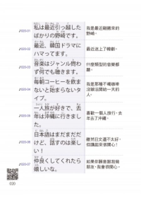 日語會話就是要邊聽邊唸,才能培養語感、正確發音。只要用「Youtor App(內含VRP虛擬點讀筆)」掃描書中QR Code即可隨時聆聽日籍老師的日語會話音檔,同時鍛鍊日文聽力跟口說能力。