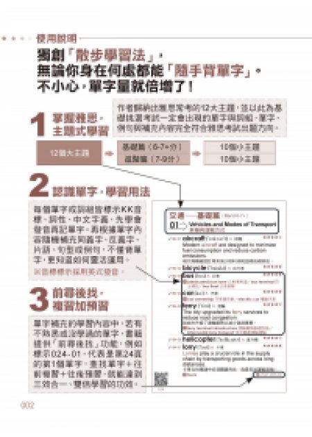 單字補充的學習內容中,若有不熟悉或沒學過的單字,書籍提供「前尋後找」功能,例如標示024-01,代表是第24頁的第1個單字,查找單字+往前複習+往後預習,就能達到三效合一、雙倍學習的功效。