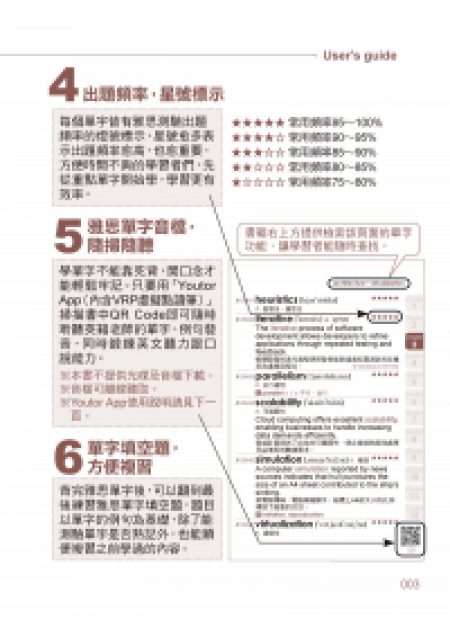 除了用眼睛背單字之外,用耳朵記憶、熟悉發音更是背好單字的訣竅。書中提供單字、例句與補充內容的音檔,只要搭配隨書附贈的Youtor App(內含VRP虛擬點讀筆),掃描書中QR Code下載音檔,只要下載完成後,就可以隨掃隨聽,離線也能聽,再也不用費心尋找CD播放器了。