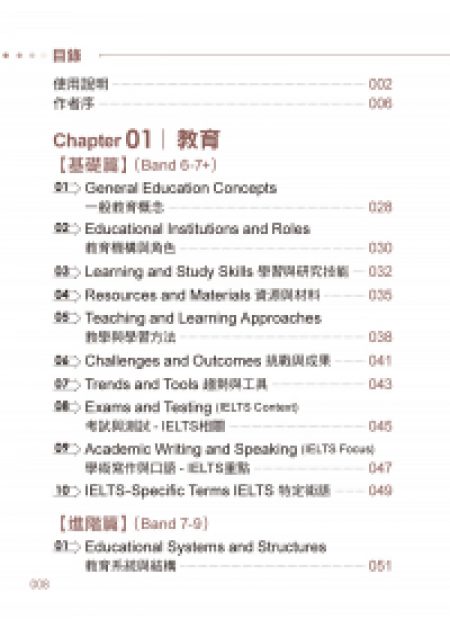 全書依照雅思IELTS常考主題分類成12大主題,再依據目標分數分成基礎篇與進階篇,如果目標分數是6~7分,基礎篇的單字一定要會;想要進階挑戰7~9分,就要多加練習進階篇的單字。
