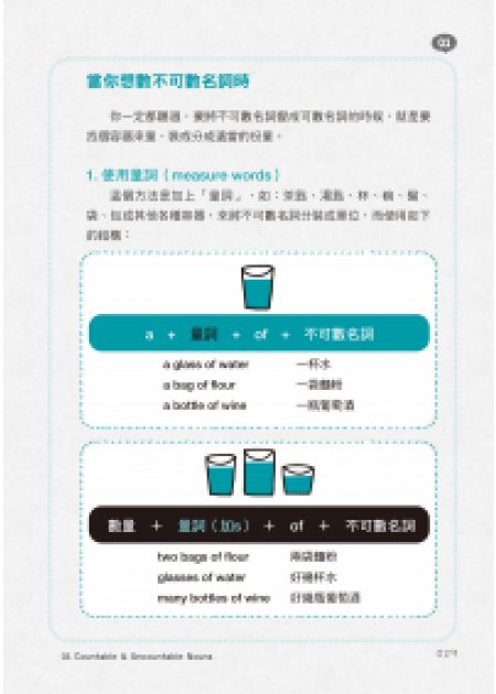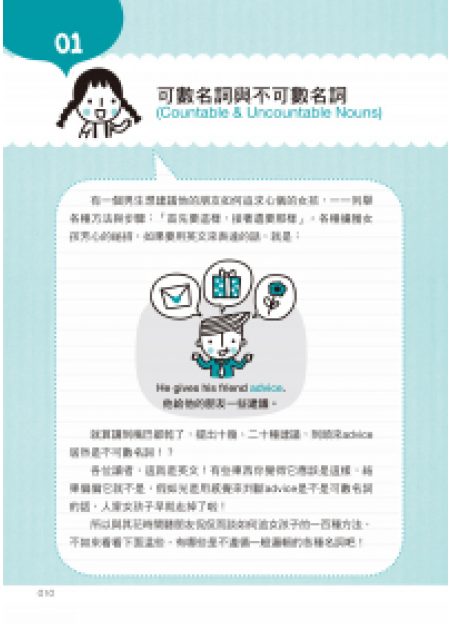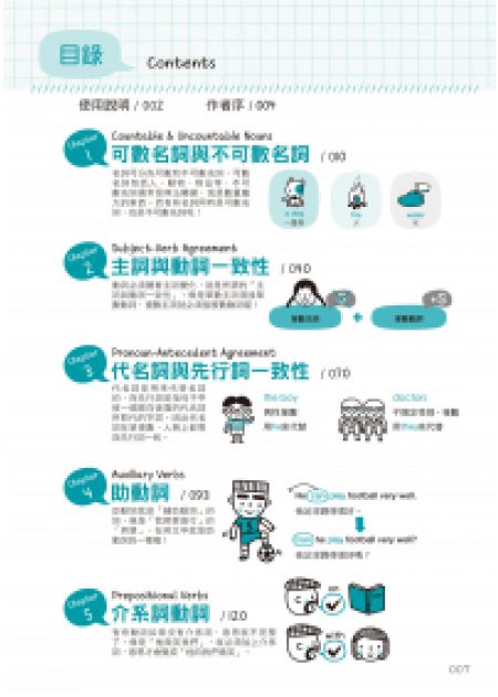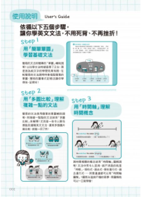 本書所收錄的文法,是屬於較詳細的英文文法,以及一些雖然是基礎文法,但也是屬於更深入更繁複的部分。而我們透過圖表的方式解說,搭配有系統的解釋,以及會發生在實際生活中的範例,讓讀者更容易理解這些文法,對這些書中的例子更有信心,可以牢牢地記住,而且還可以真正地使用這些實用的文法。