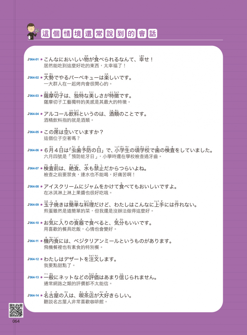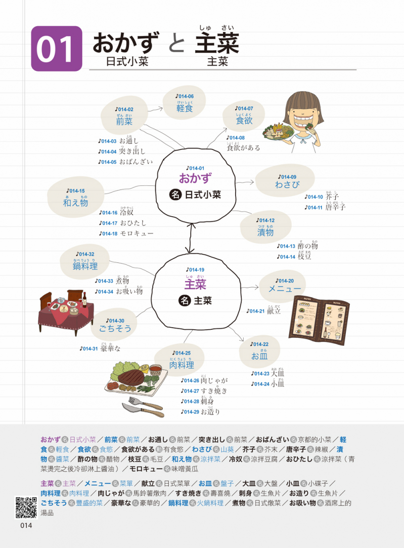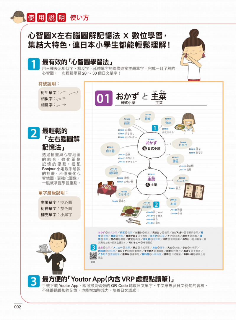 除了心智圖和插圖的學習之外,下載「Youtor App(內含VRP虛擬點讀筆)」,只要掃書中QR Code,就可以聽到單字還有會話句的音檔,想必對各位讀者一定會有幫助。