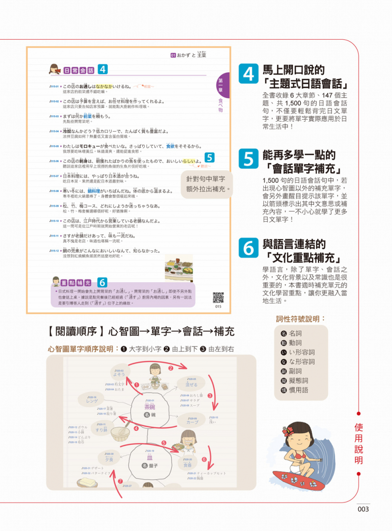 本書以最貼近日常生活的6大章節:食物、衣服、住宅、交通、教育、娛樂為主架構,再細分成共147個小主題的心智圖,每個主題更補充1015句的實用日語會話句,將單字實際應用於生活中。