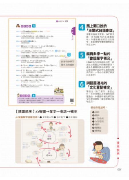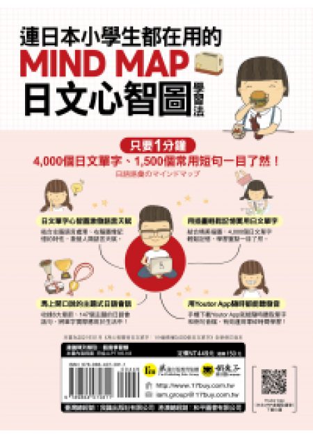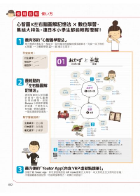 • 很高興這本《連日本小學生都在用的MIND MAP日文心智圖學習法》能改版上市。這本書分有六大主題,分別是飲食、衣物、住宅、交通、教育以及娛樂。搭配上豐富可愛的插圖,學習起日文會更加地有趣、輕鬆。