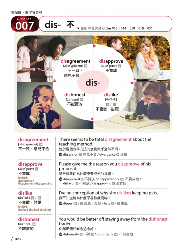 想增進英文能力不能只記得單字要怎麼拚,更需要知道單字的衍生變化、例句的應用方式、同義字與反義字……等。本書單字除了有詳盡的學習資訊,更搭配照片補充會話句,多種學習內容,一次滿足。